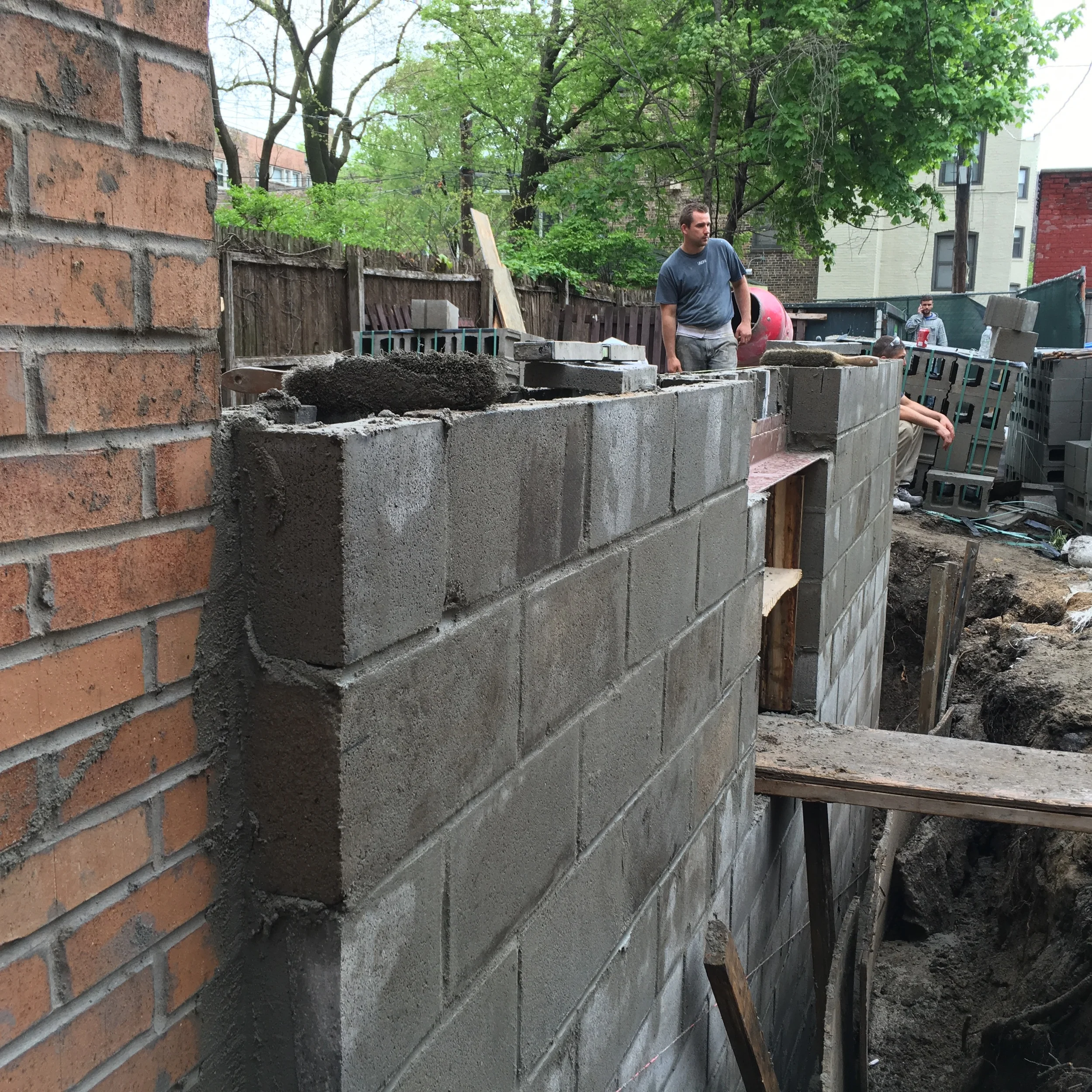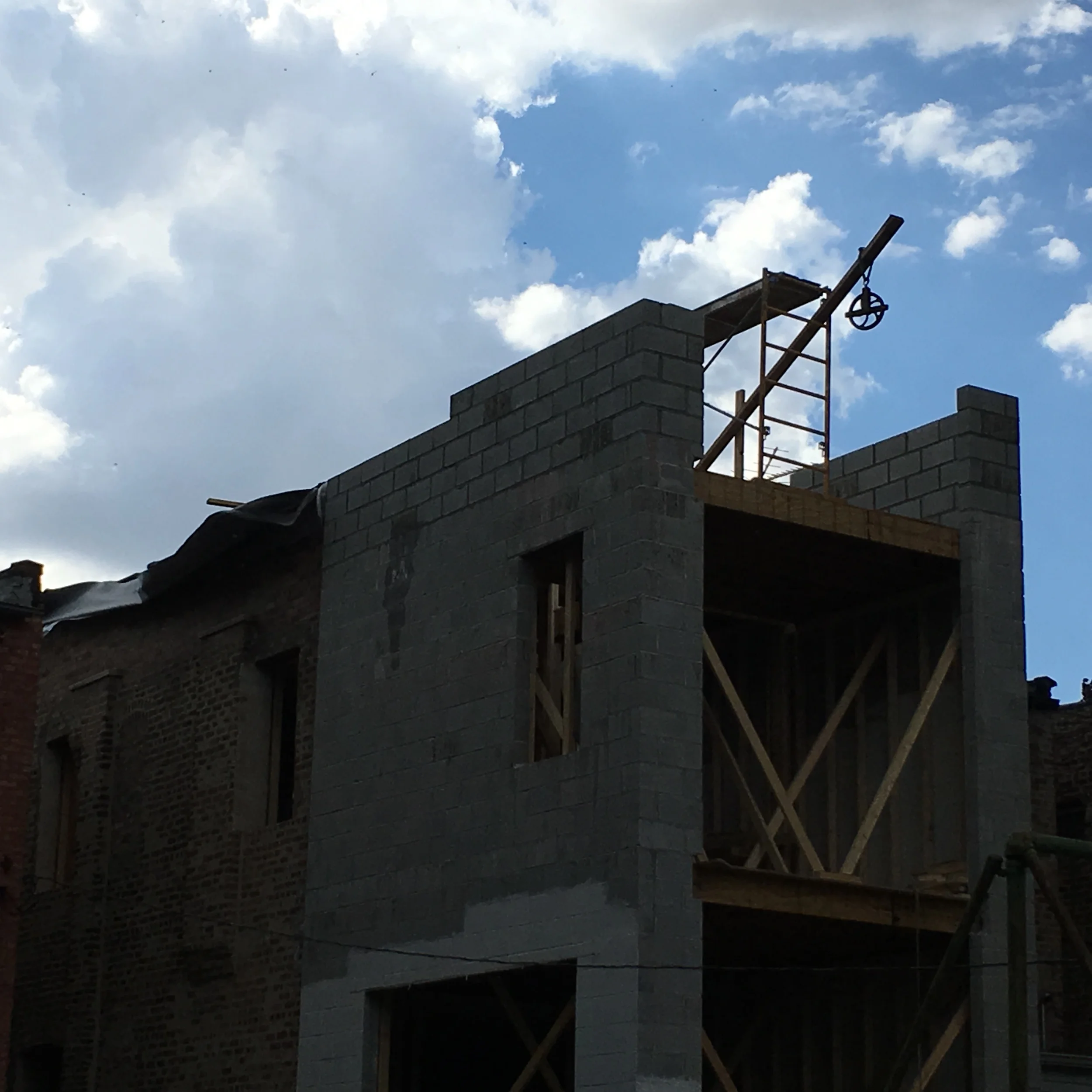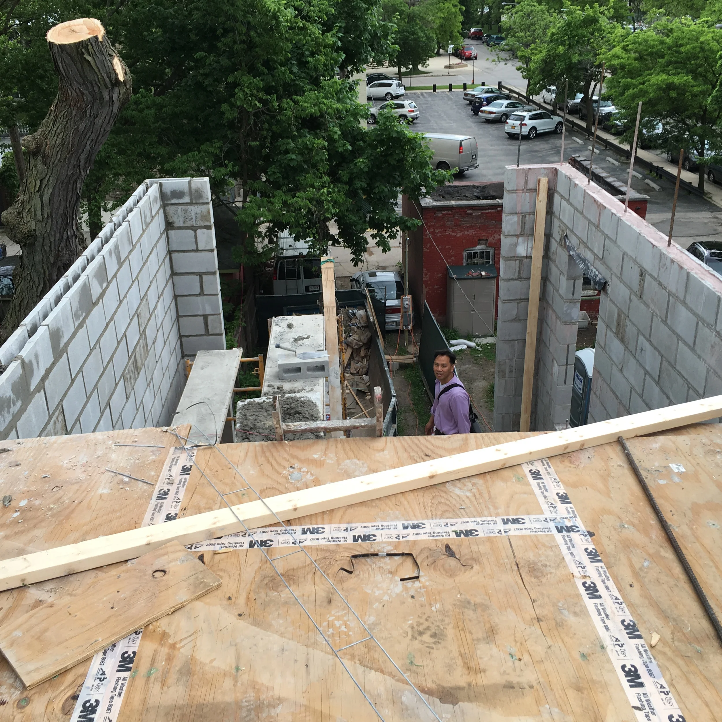 Fully grouted CMU with rebar. 3.5 hour fire rating. The third floor straddles triple wythe brick main structure with new CMU.