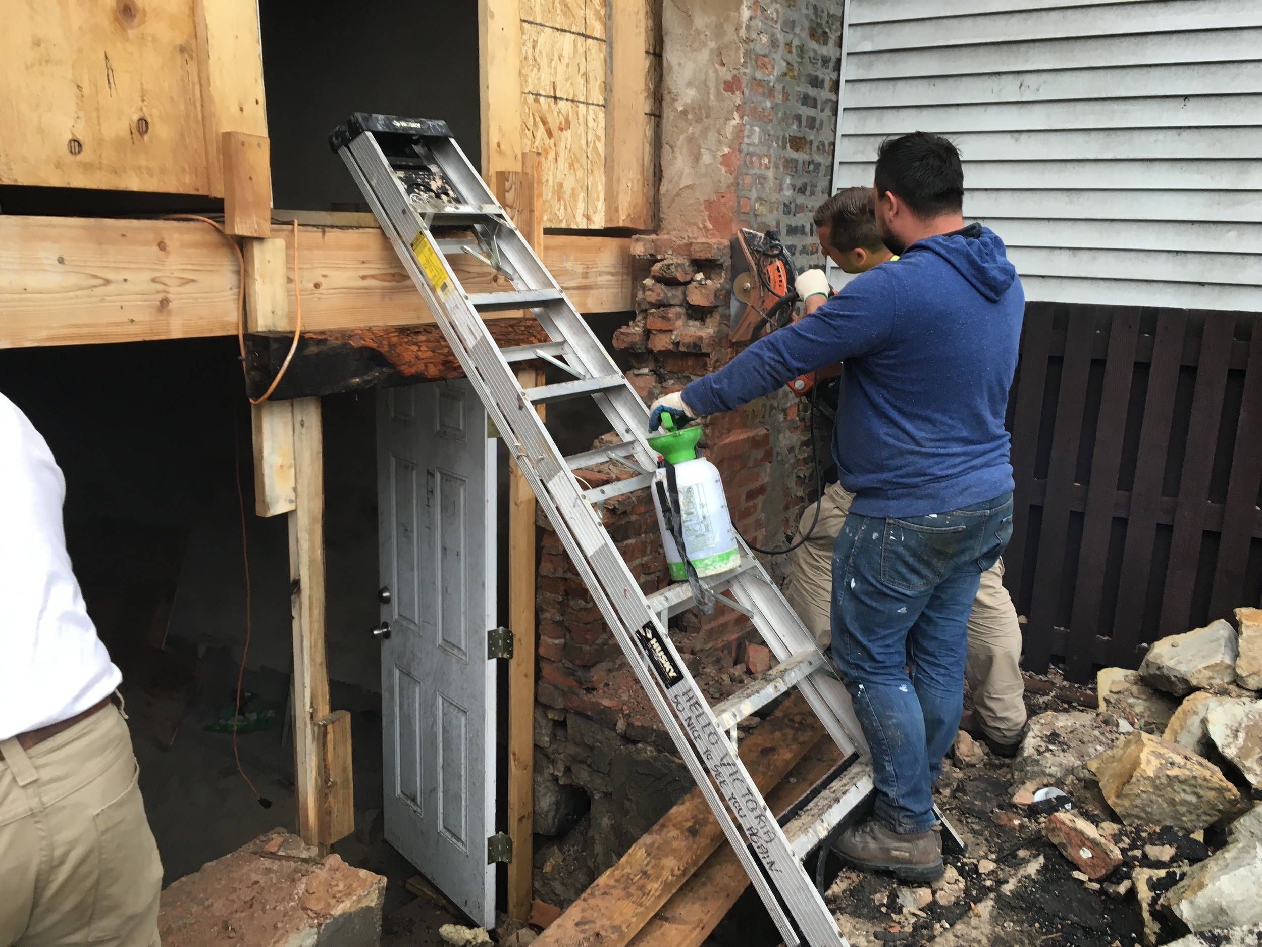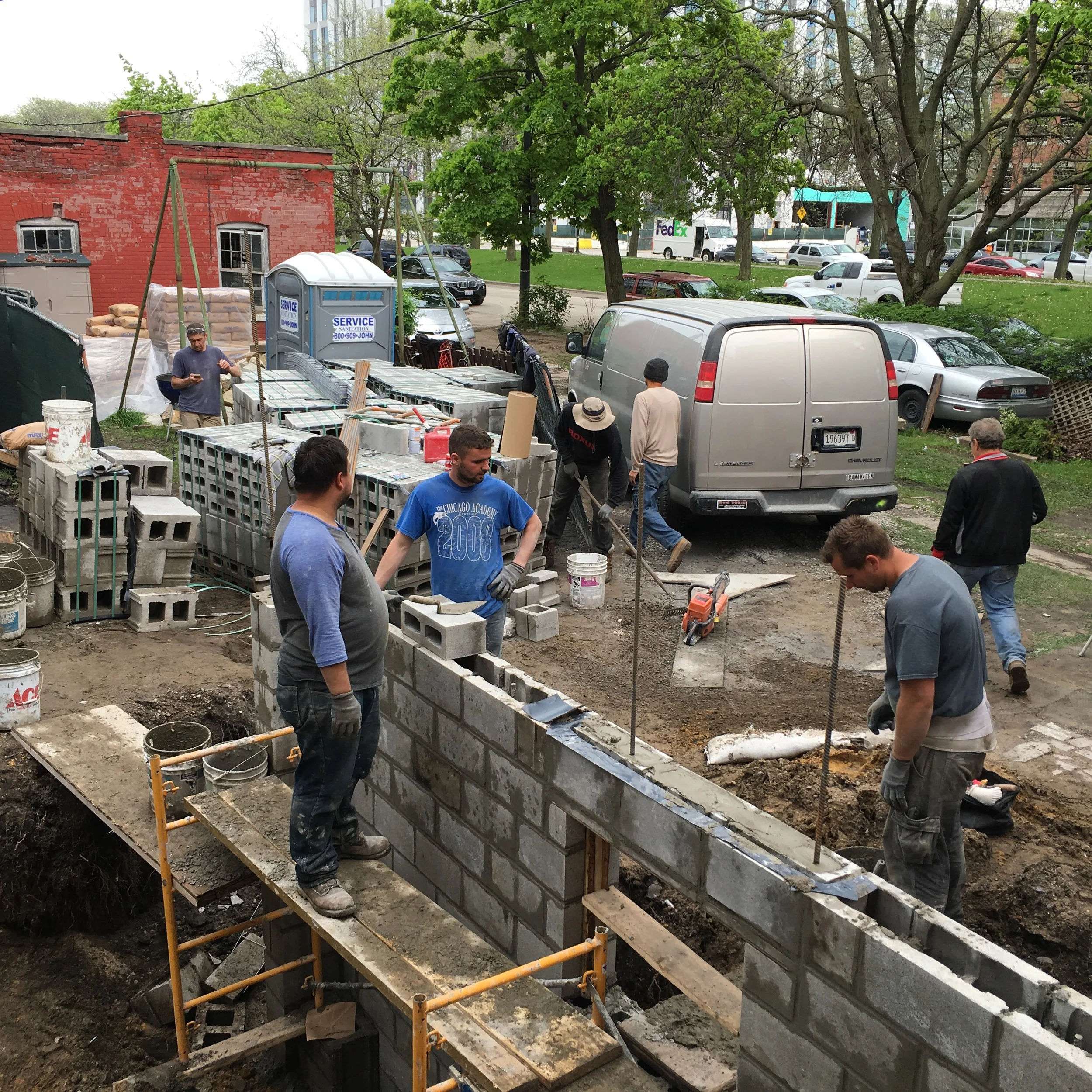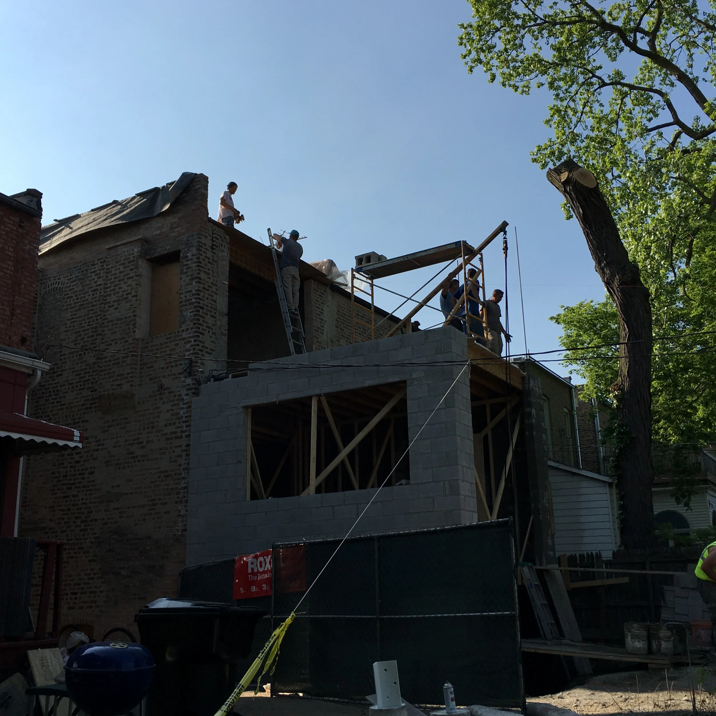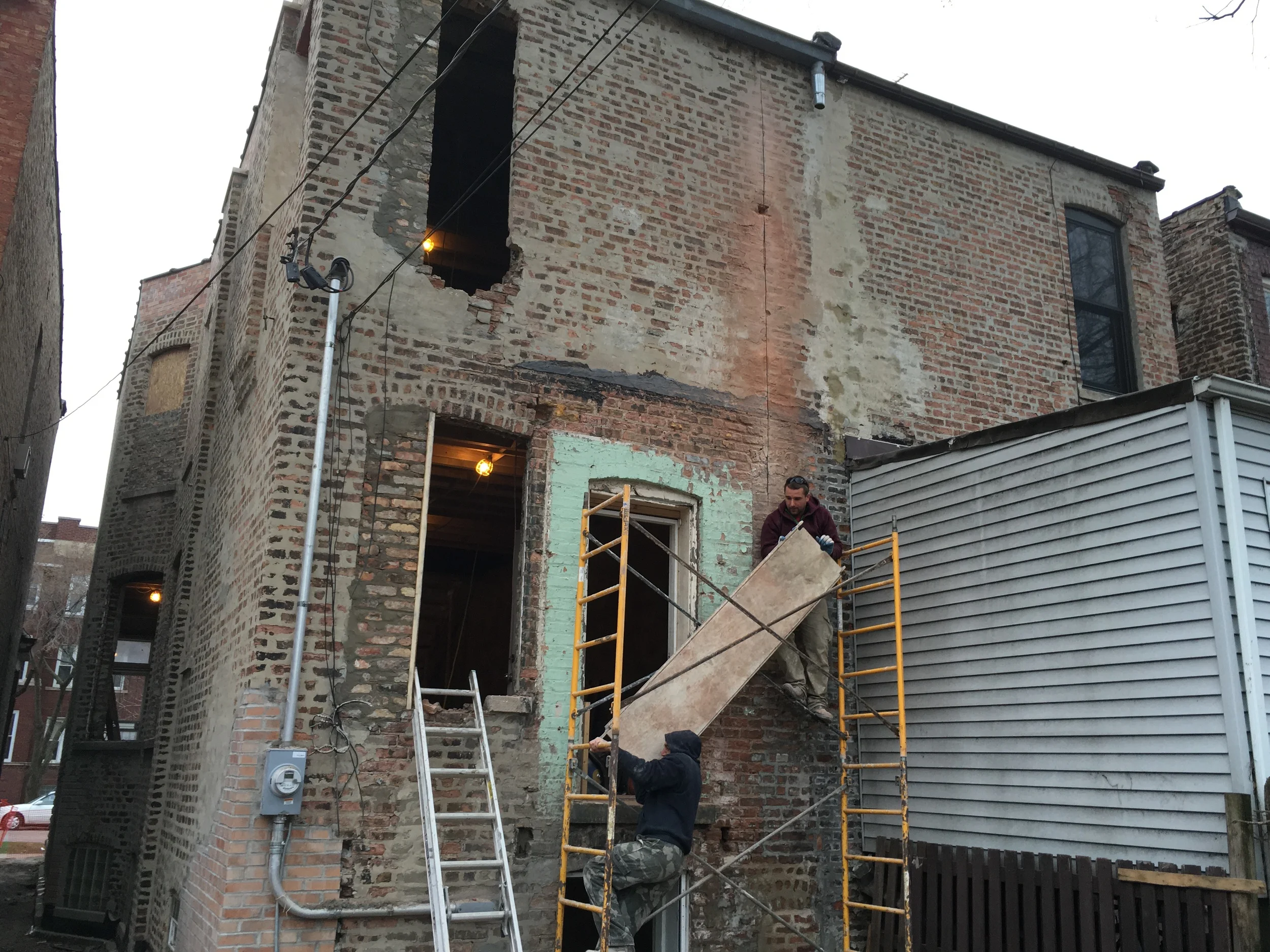 Fully grouted CMU with rebar. 3.5 hour fire rating. The third floor straddles triple wythe brick main structure with new CMU.
