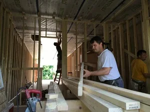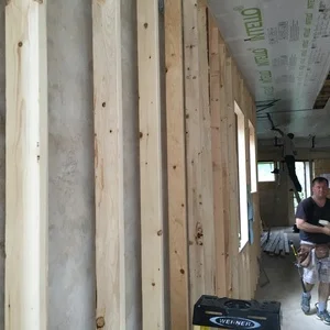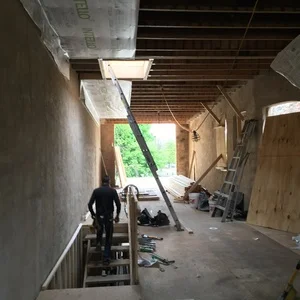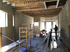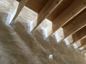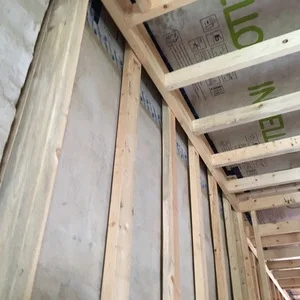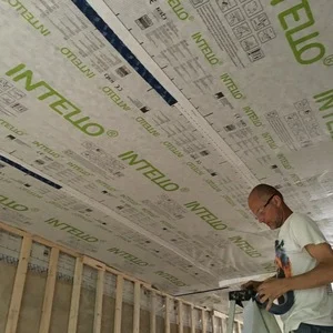 With the roof joists fortified and replaced and rough window openings and walls parged, we placed a Pro Clima Intello vapor open membrane against the bottom of the roof joists as proscribed by 475 High Performance Building Supply's method. Dense pack cellulose will be packed between each joist and below the new roof deck in due course. We taped the seams with Pro Clima Tescon Vana tape and adhered the "floppy bit" (tail) of the Intello membrane to the parged walls with a continuous bead of Pro Clima Contega HF caulk and additional Contega Solido SL tape. Non-structural perimeter framing members were placed standing off from the parged walls in accordance with our PHPP derived insulation model. In due course a membrane will be applied to the exterior wall framing and dense packed cellulose placed directly against the parged walls. We placed a ceiling service cavity for conduit and lighting to avoid penetration of the air tight roof/ceiling layer.