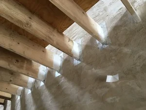 We discovered several bricked up windows which we re-opened. In the balance, windows provide free winter time solar energy. We also found a large original skylight opening buried among the layers which we rebuilt. We repaired and parged the rough openings with lime plaster creating a continuous seam with the interior parged walls, the first step in creating a continuous air tight barrier. Subsequently, layers of insulation and tape will be applied creating a continuous, insulated air tight and water tight barrier.