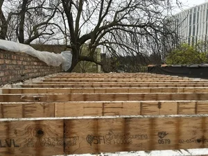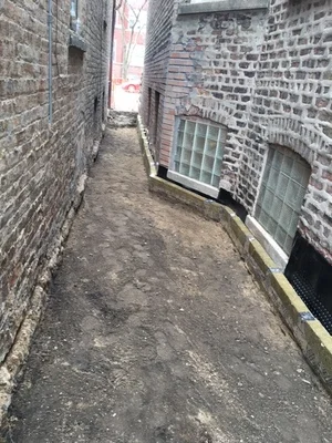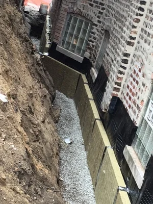 Below grade, the exterior foundation walls were cleaned, tuckpointed and waterproofed and then, an additional dimple membrane and insulation layer reaching below the footings was installed.