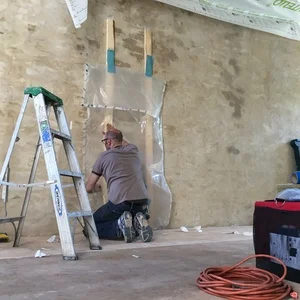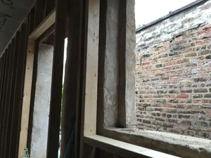 We tested the mortar composition of the original structure which proved to be uniformly lime mortar. We then used this same lime mortar to plaster all interior wall surfaces of the original structure to create an air tight, water tight and vapor permeable surface while fortifying the original brick structure. For a little fun and to get a baseline, we tested the air-tightness of the wall which averaged ~ .32 ACH at 25 Pascals. Subsequently, all joist pockets were taped and caulked with Pro Clima Contega Solido SL tape using a methodology provided by 475 High Performance Building Supply.