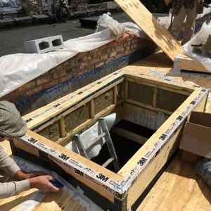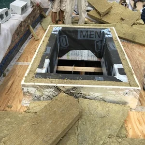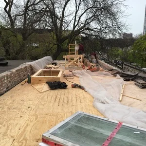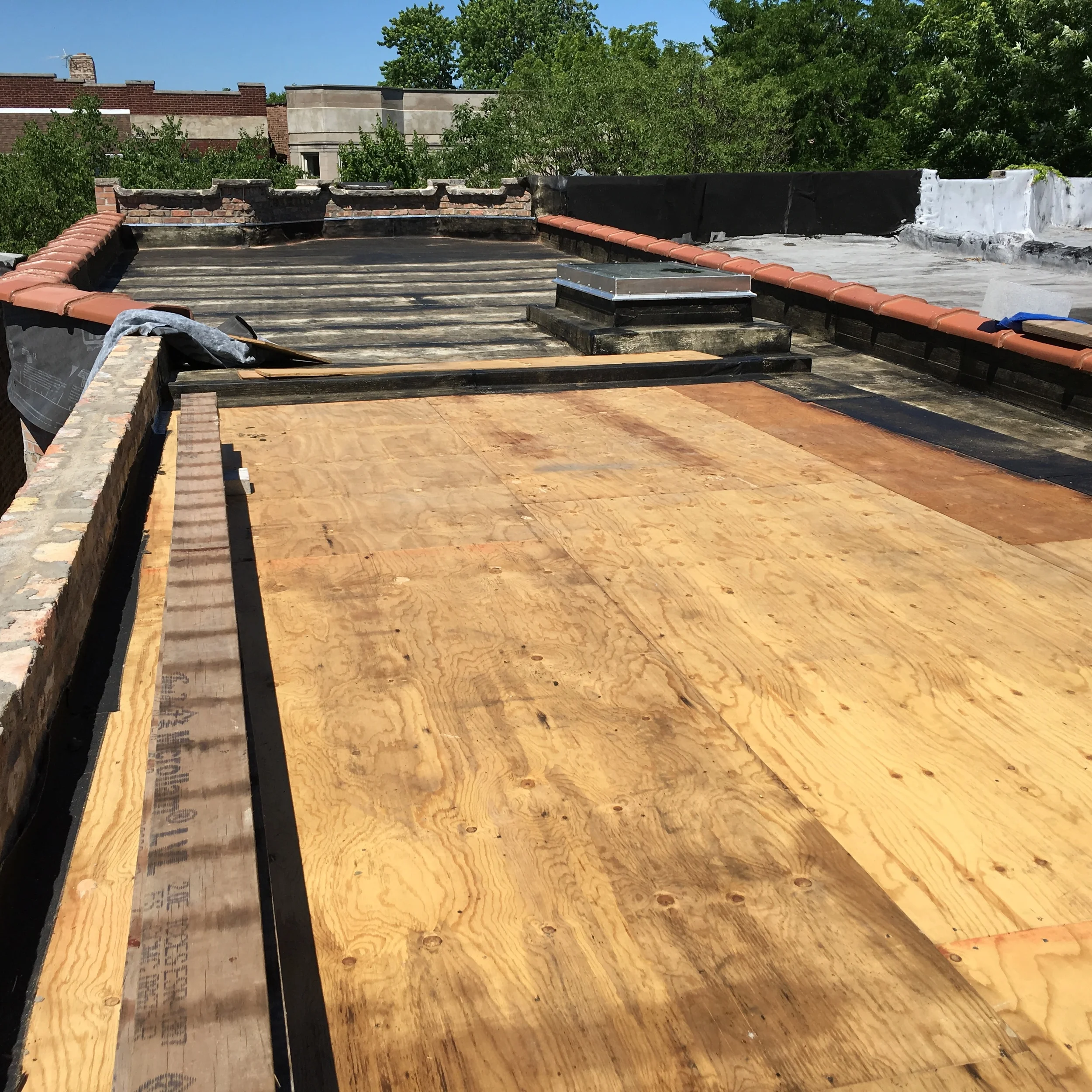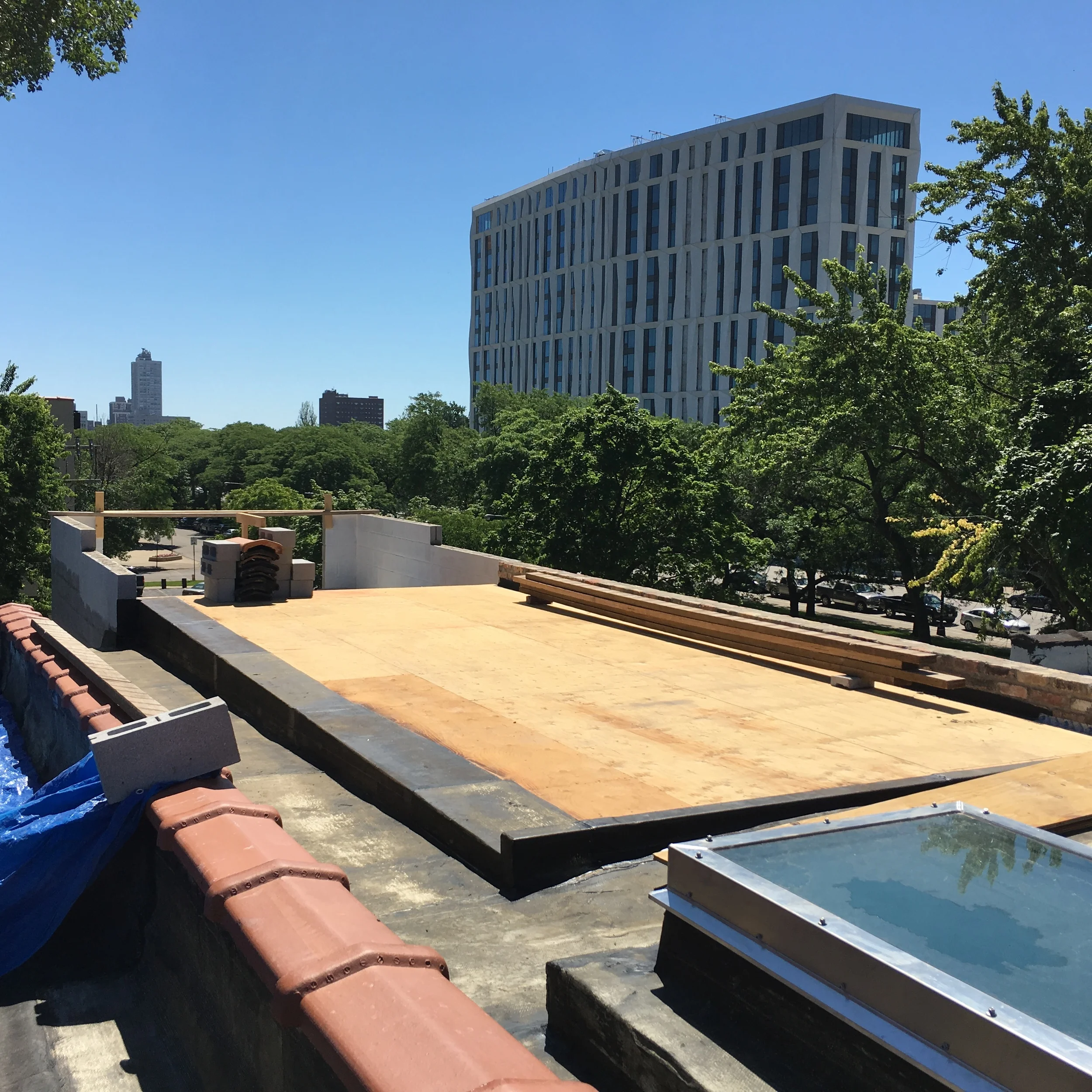 We replaced the roof deck in its entirety with three layers of staggered and taped plywood. We placed an insulation sandwich consisting of three inches of Roxul, one inch of polyisocyanurate, another three inches of Roxul and then final roofing board and roofing material. We built and insulated a raised skylight window buck and crickets to accommodate the seven plus inches of insulation and roofing material to channel rain water around the skylight and rooftop vestibule. Before placing the rooftop vestibule floor we placed a layer of Pro Clima Mento and then six inches of Roxul on the new plywood roof deck.
