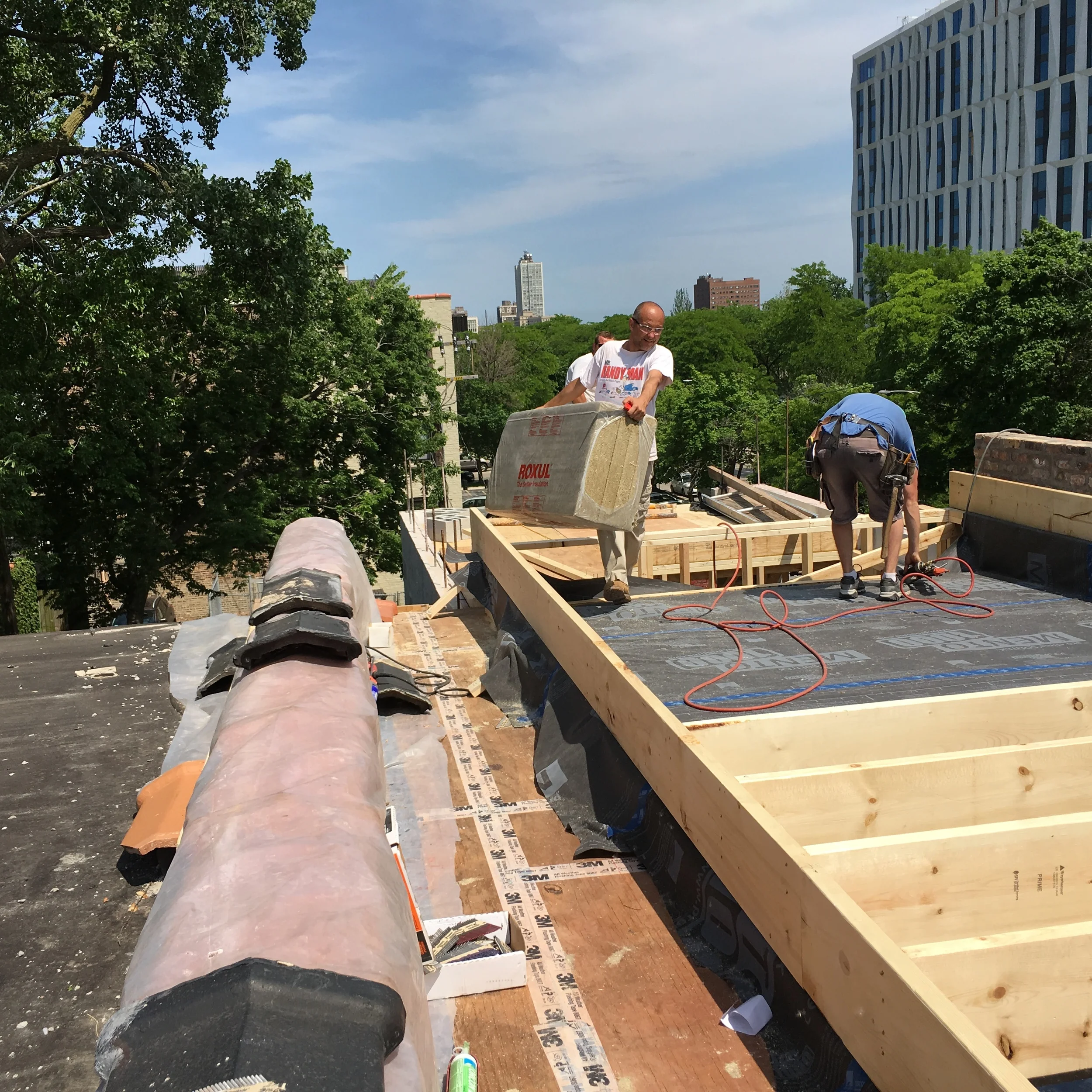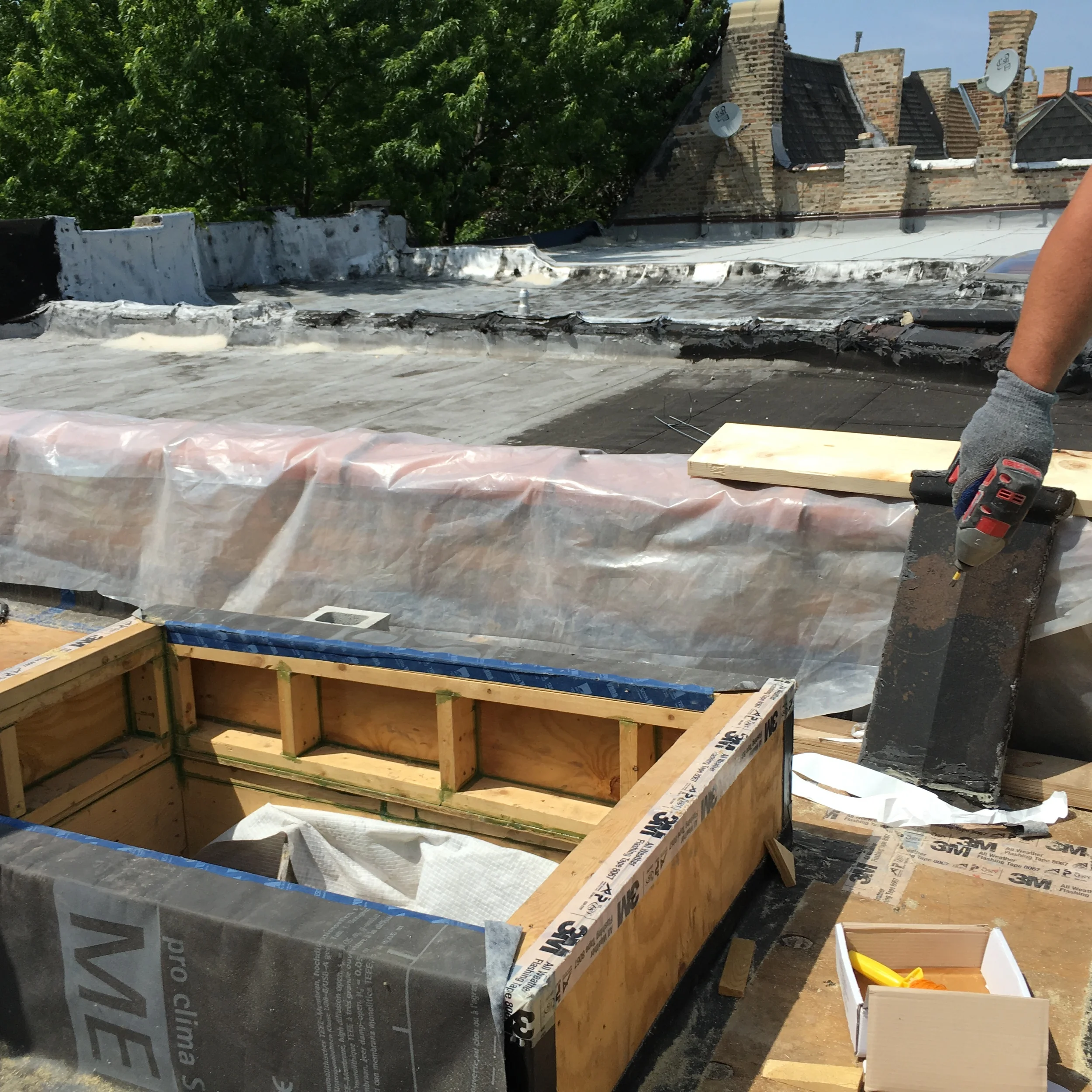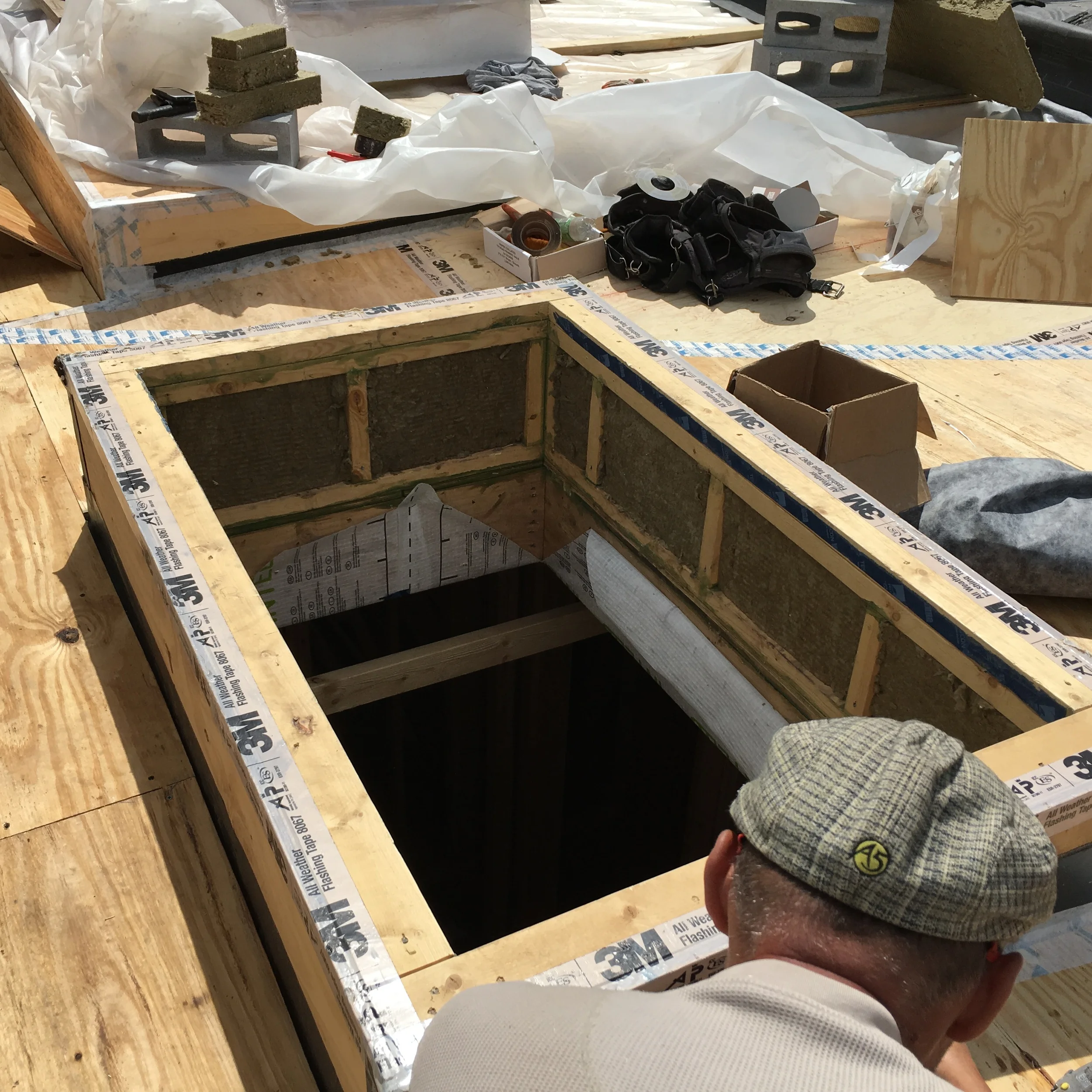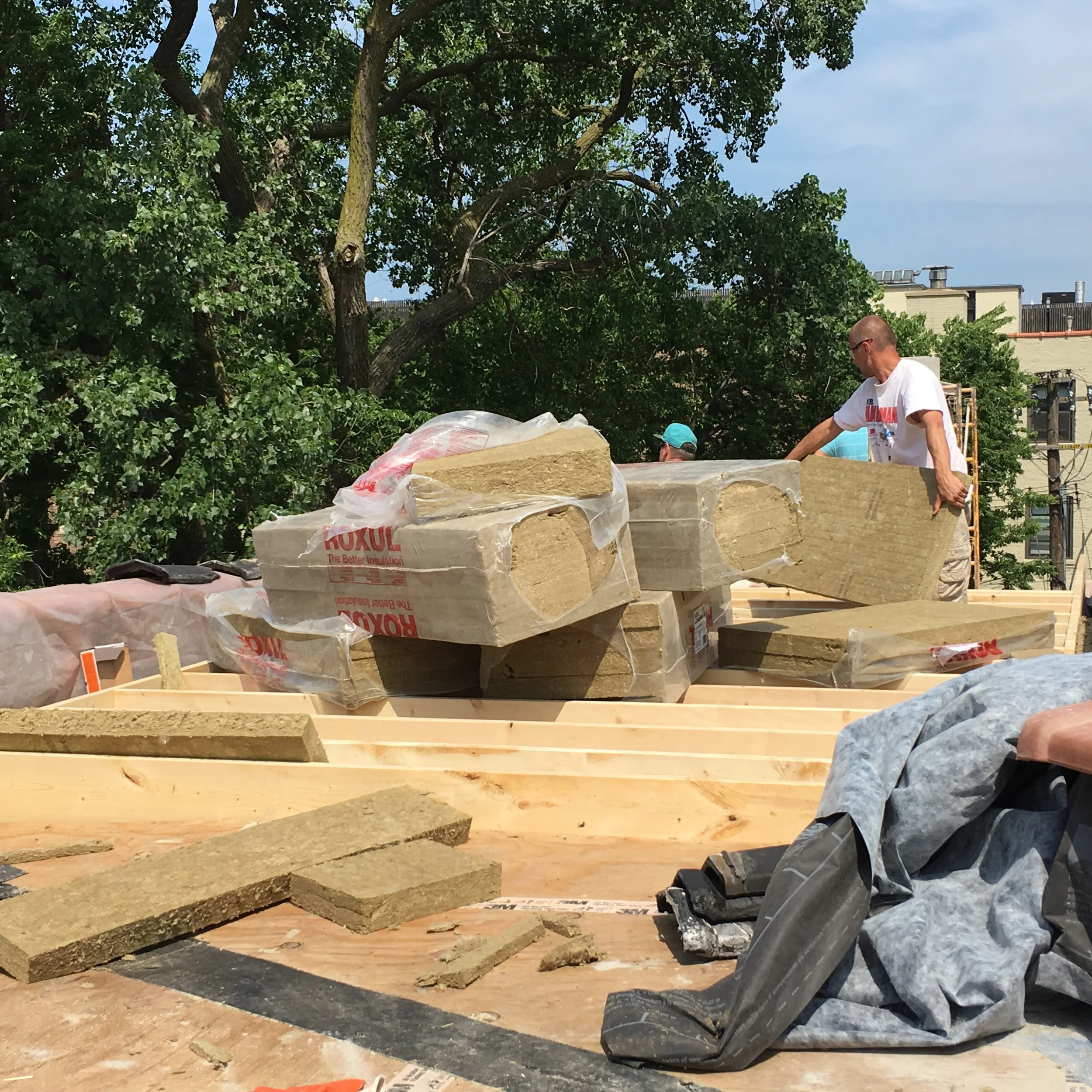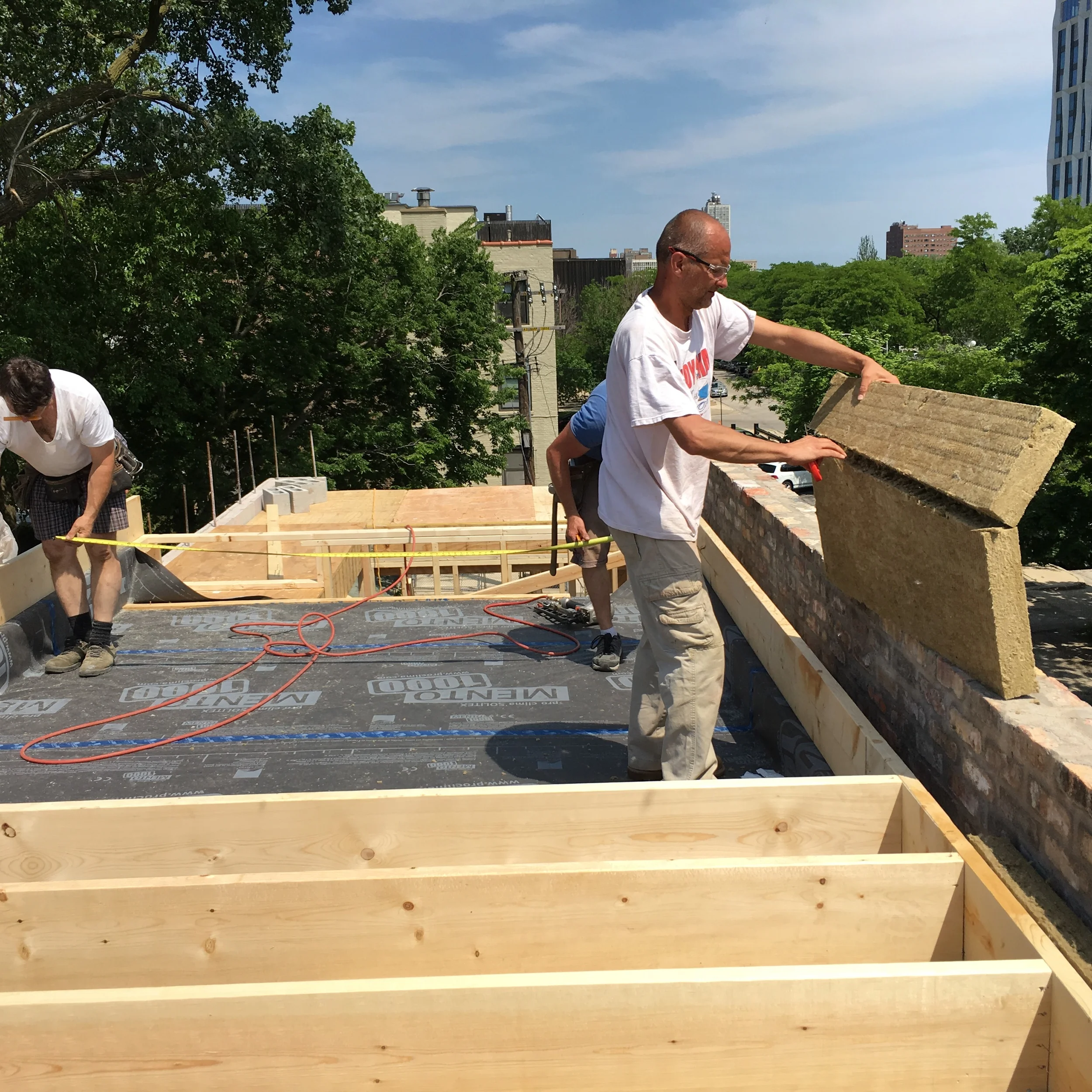 Rebuilt and heightened parapet wall. New LVL roof joists. New skylight box. New roof deck. 6 inches Roxul and 1 inch Poliso insulation above the roof deck and below the roofing material. 12 inches Dense pack cellulose in the roof joist cavities.