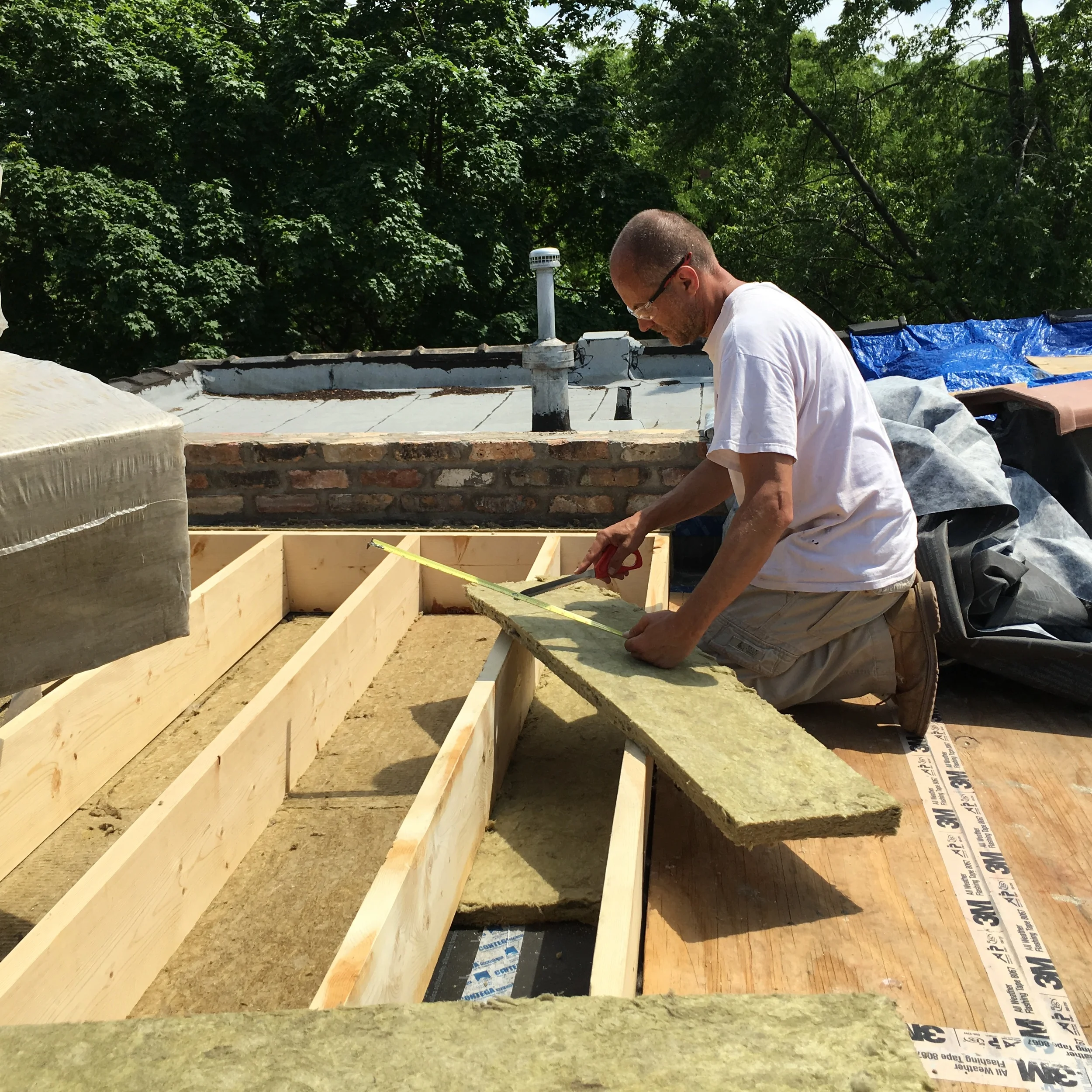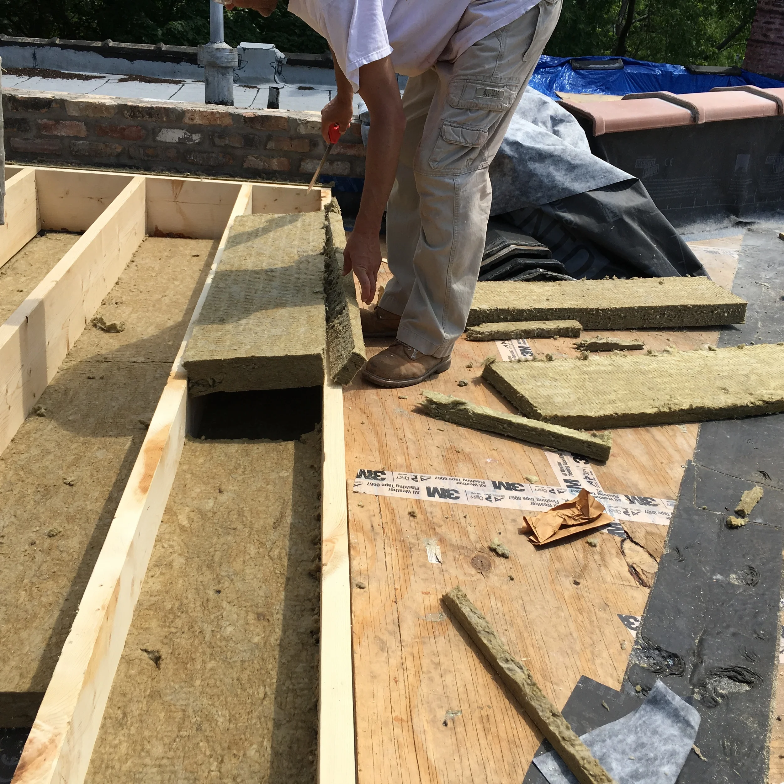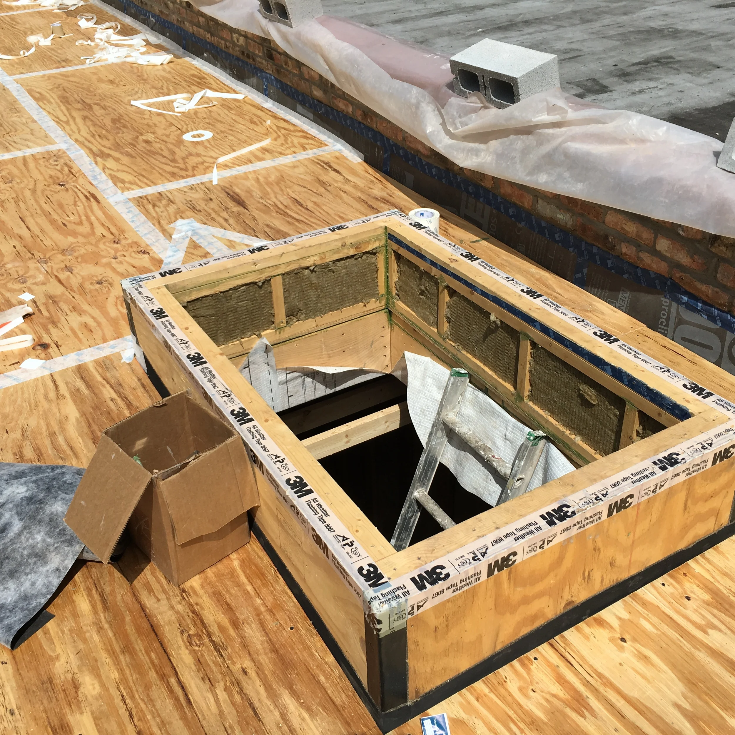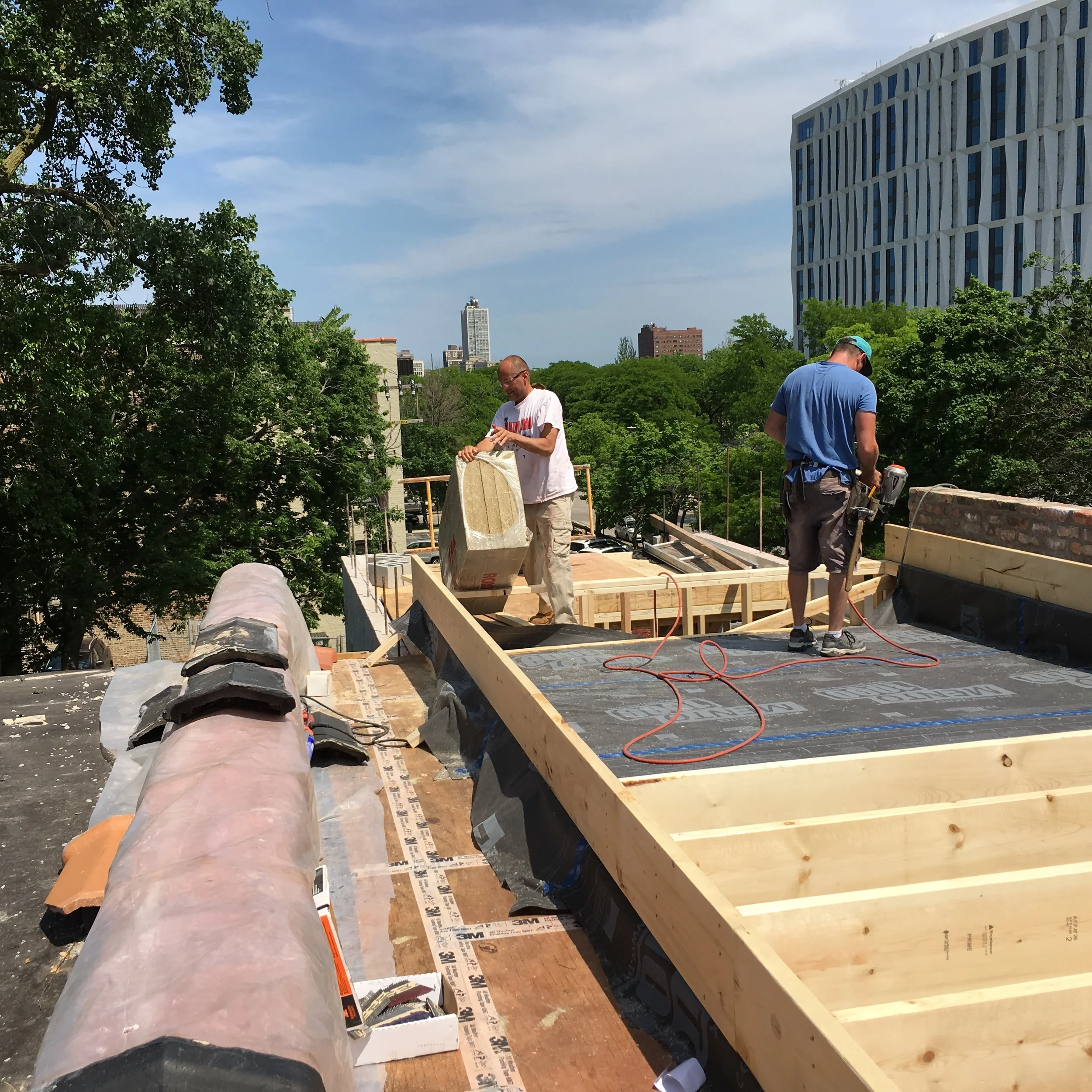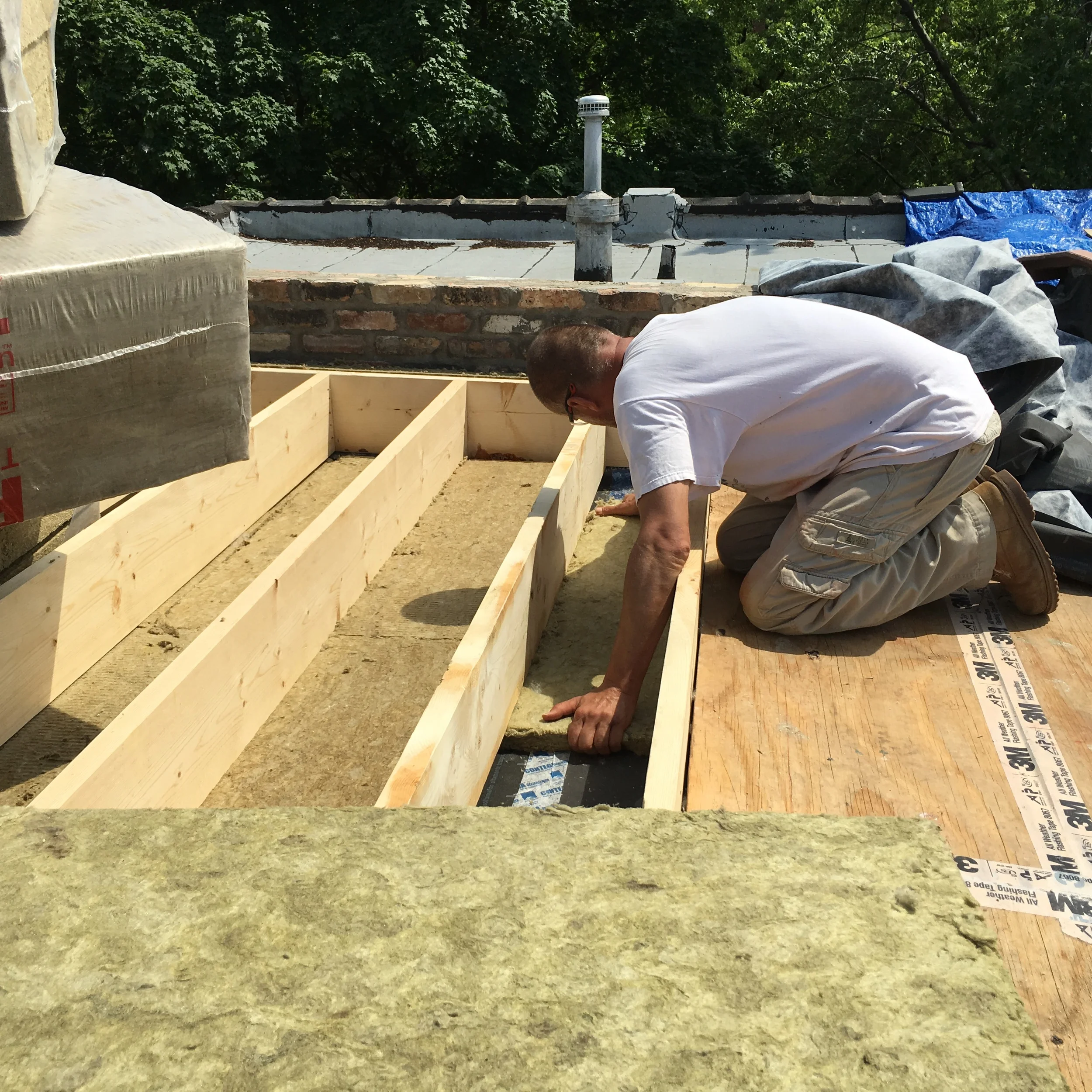 Rebuilt and heightened parapet wall. New LVL roof joists. New skylight box. New roof deck. 6 inches Roxul and 1 inch Poliso insulation above the roof deck and below the roofing material. 12 inches Dense pack cellulose in the roof joist cavities.