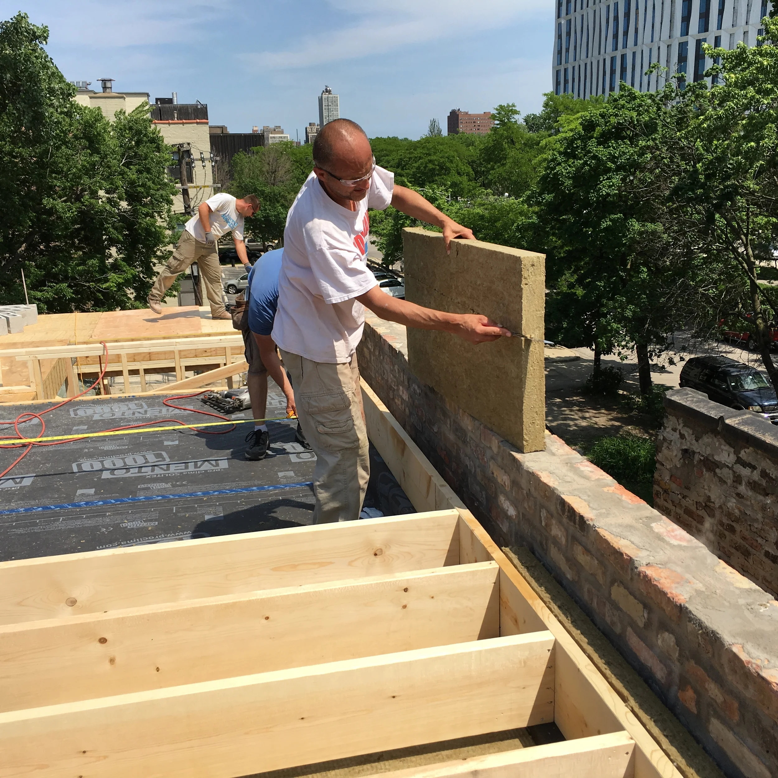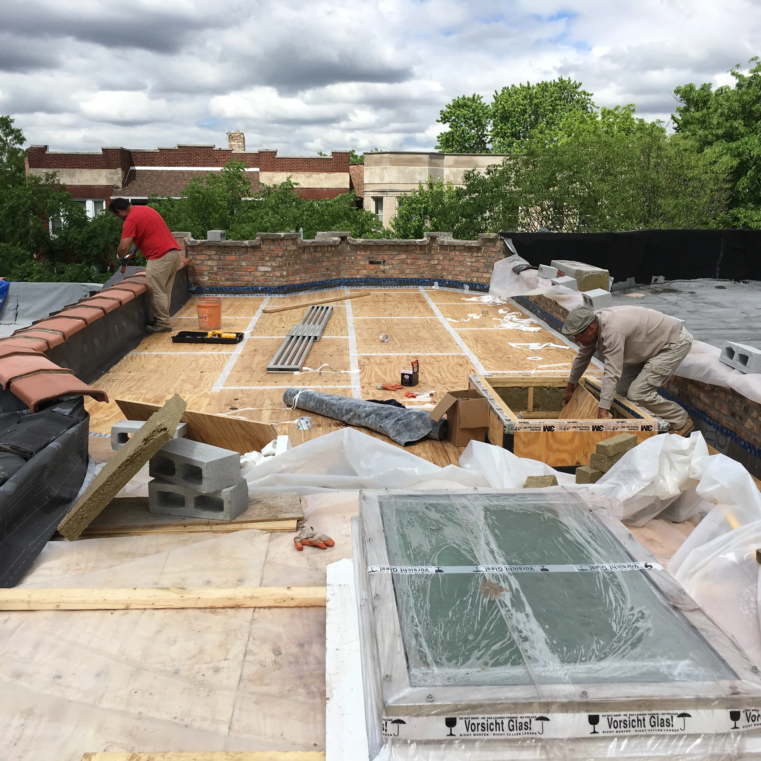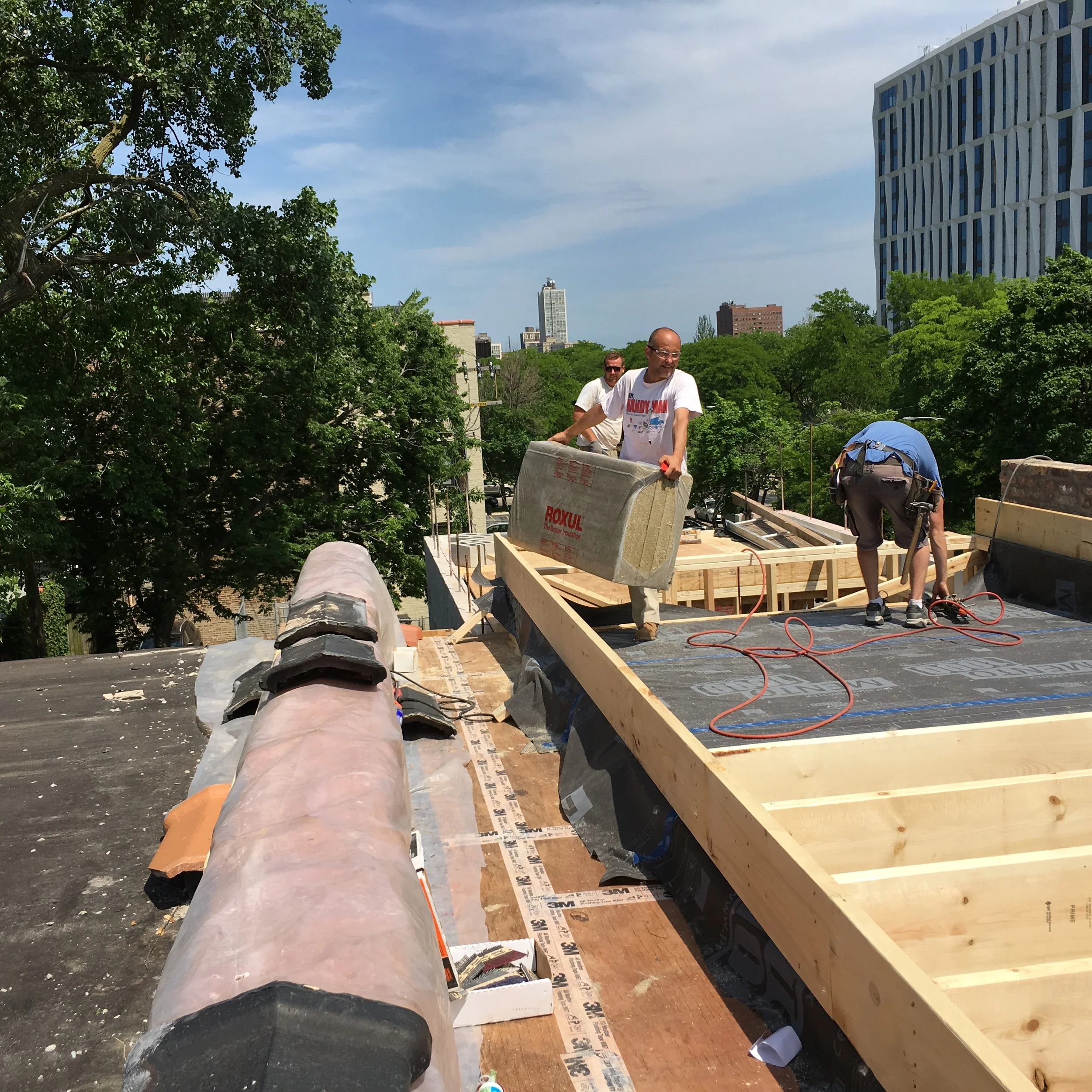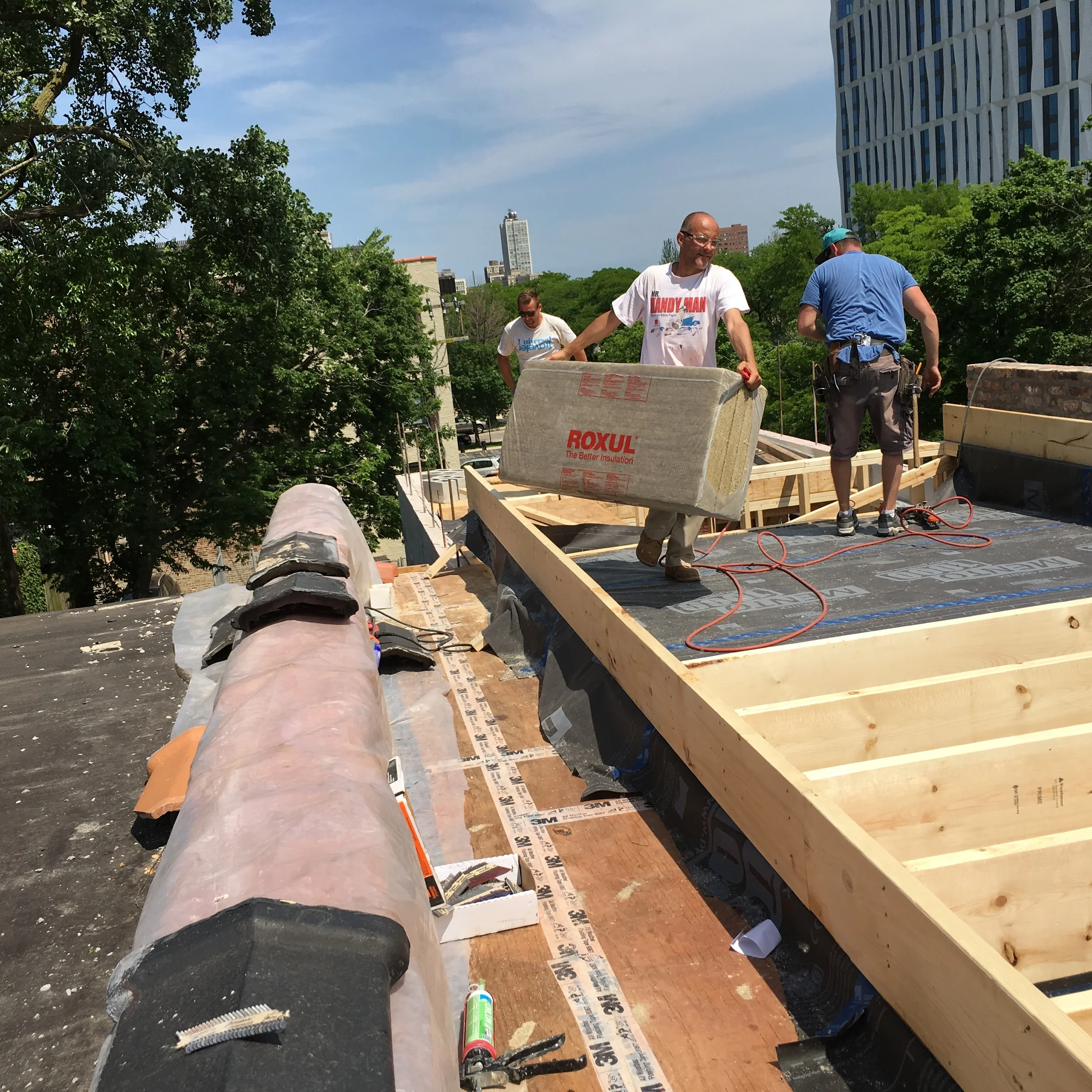 Rebuilt and heightened parapet wall. New LVL roof joists. New skylight box. New roof deck. 6 inches Roxul and 1 inch Poliso insulation above the roof deck and below the roofing material. 12 inches Dense pack cellulose in the roof joist cavities.