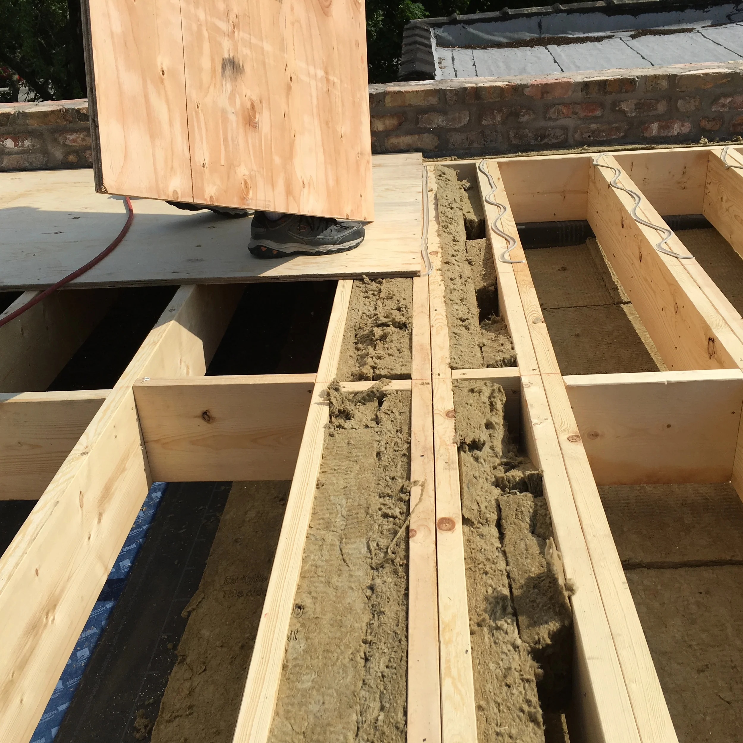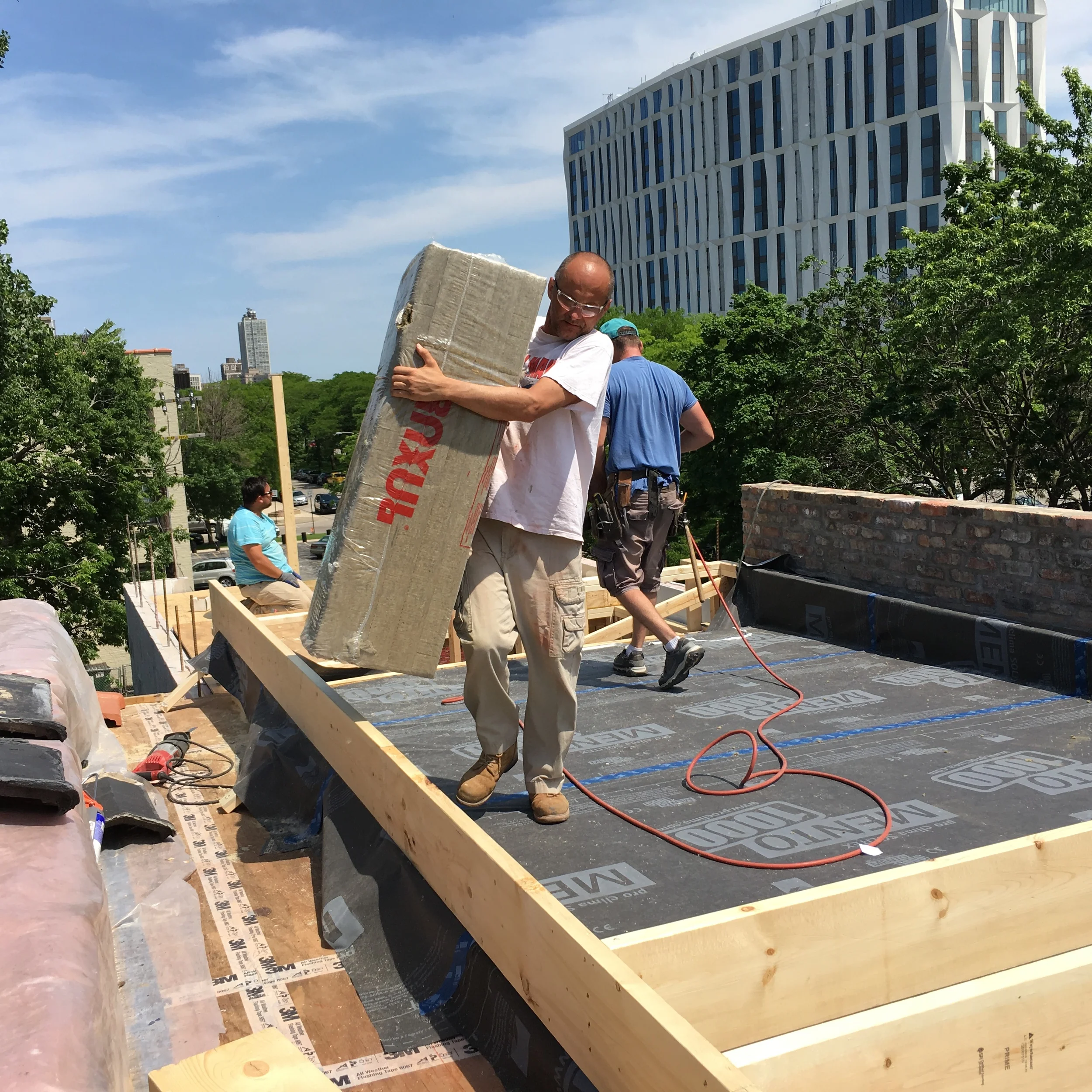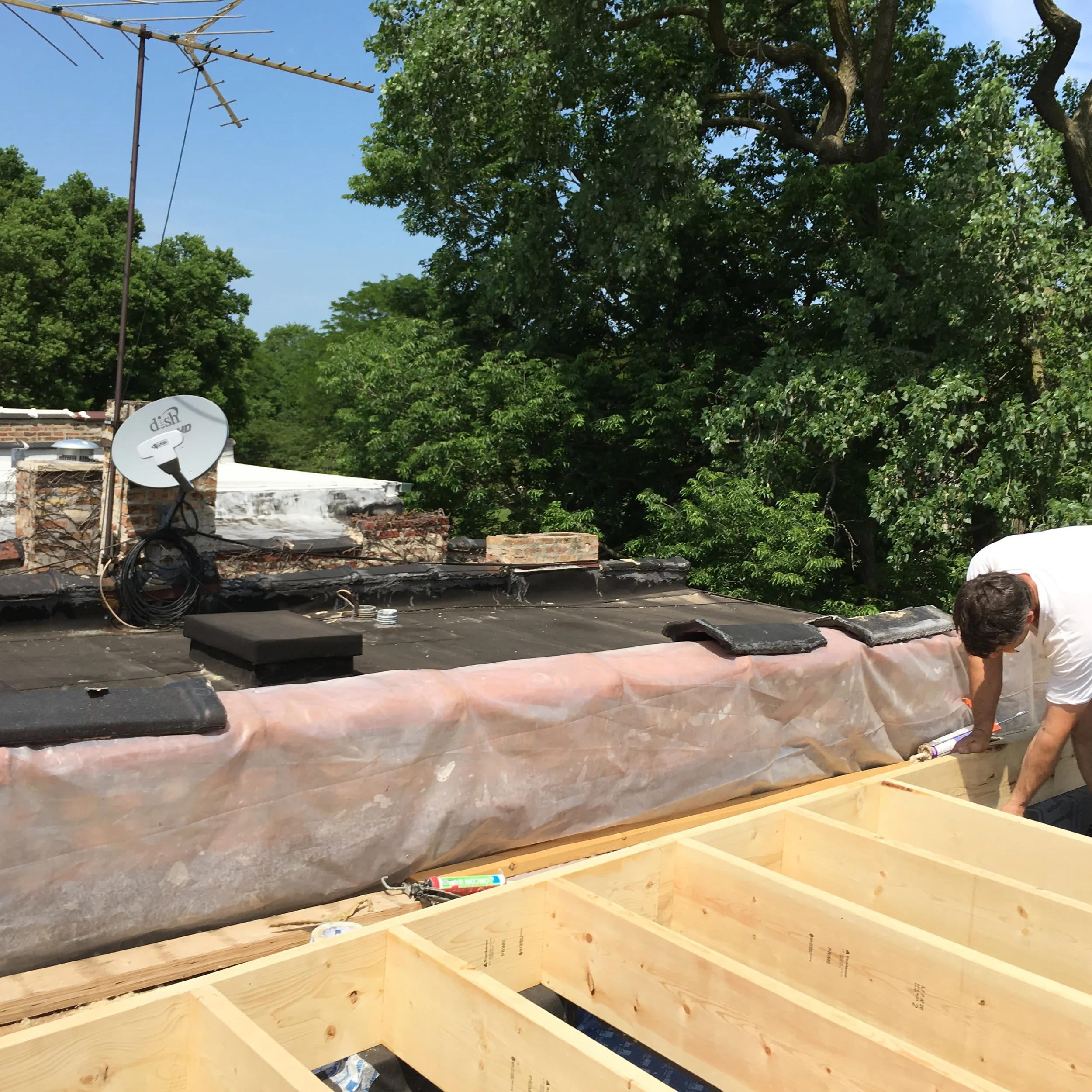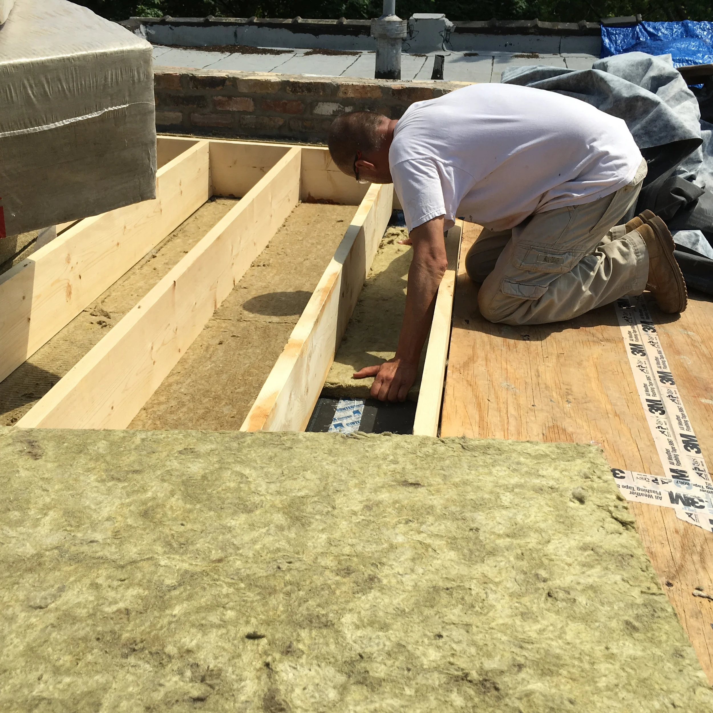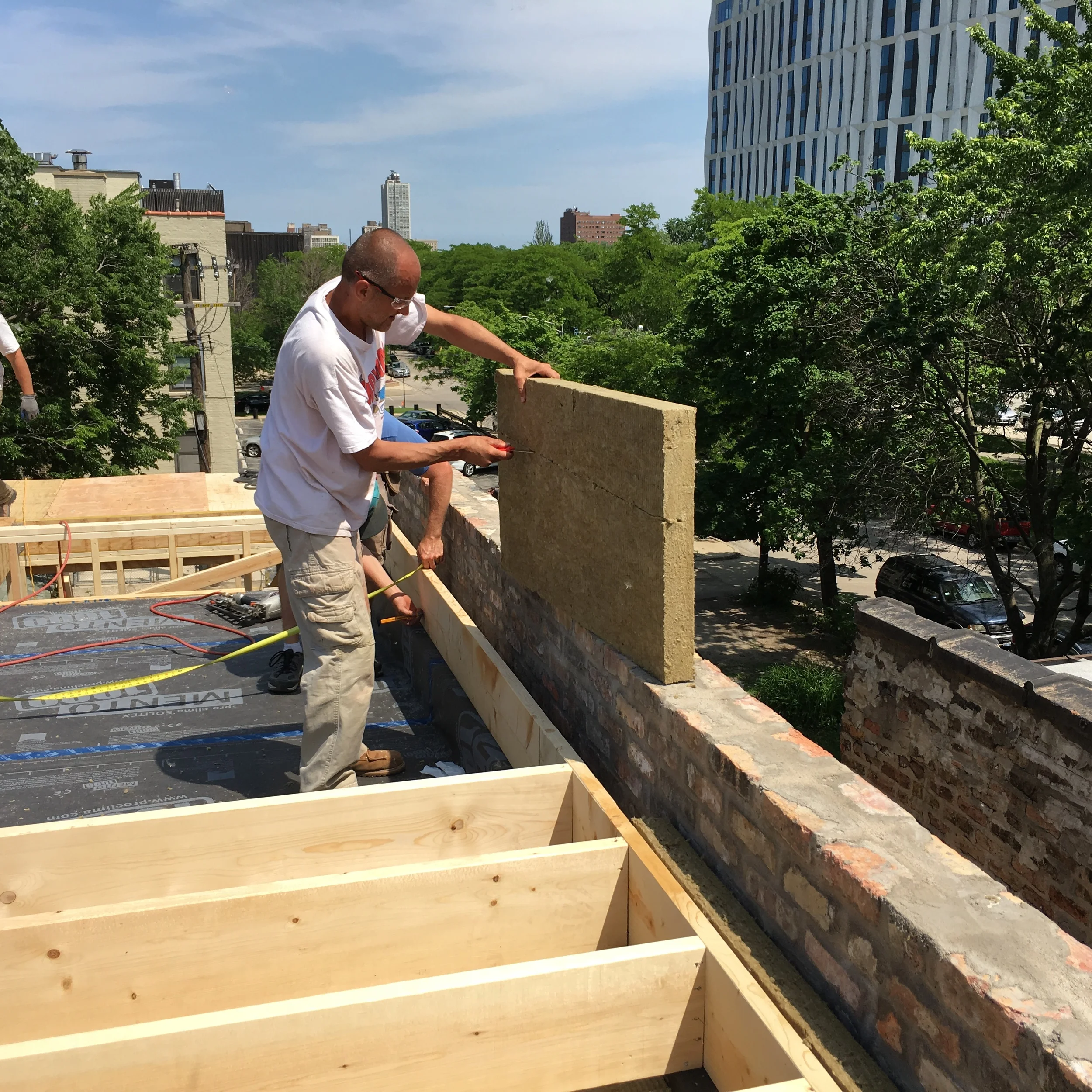 Rebuilt and heightened parapet wall. New LVL roof joists. New skylight box. New roof deck. 6 inches Roxul and 1 inch Poliso insulation above the roof deck and below the roofing material. 12 inches Dense pack cellulose in the roof joist cavities.
