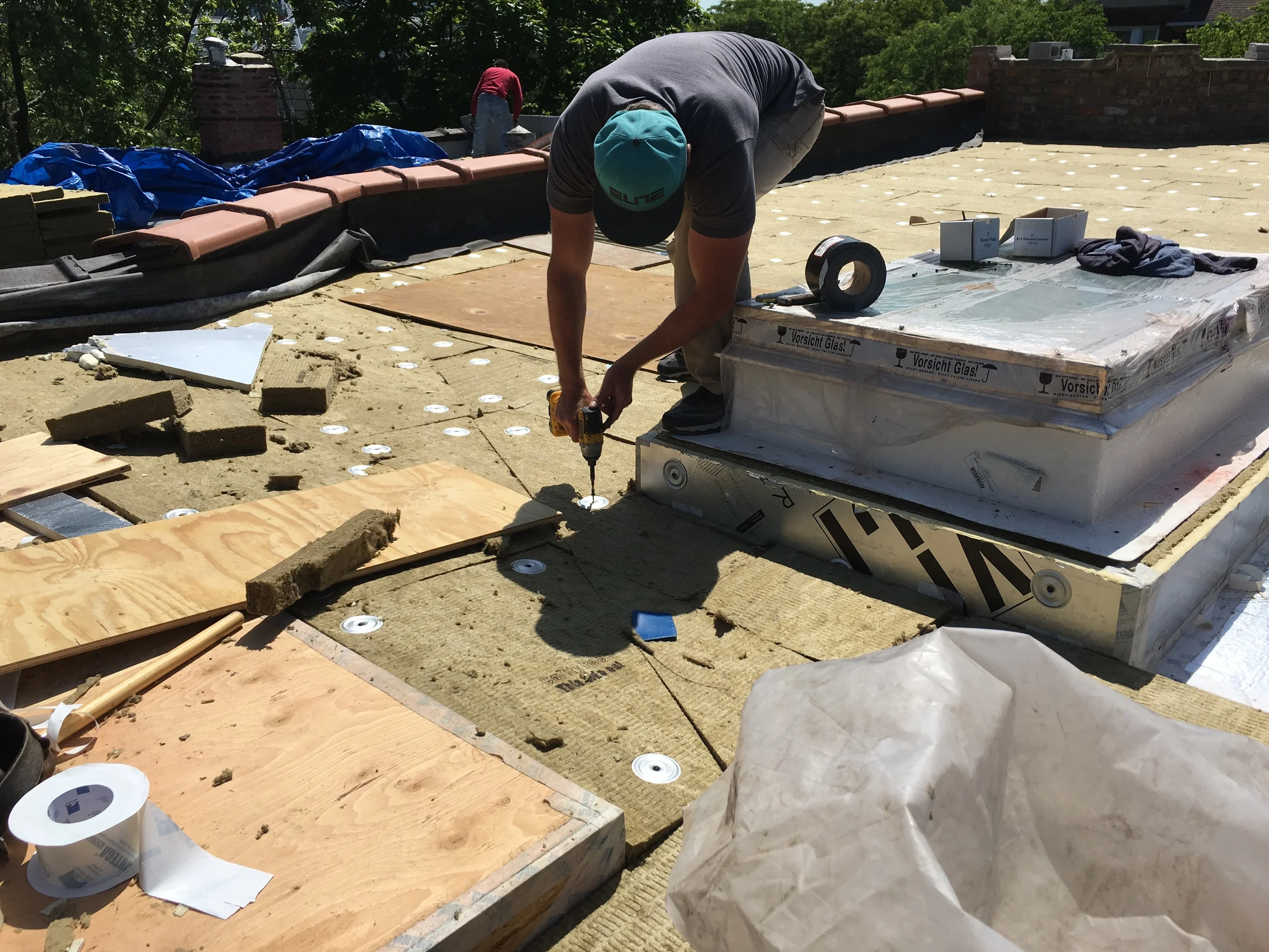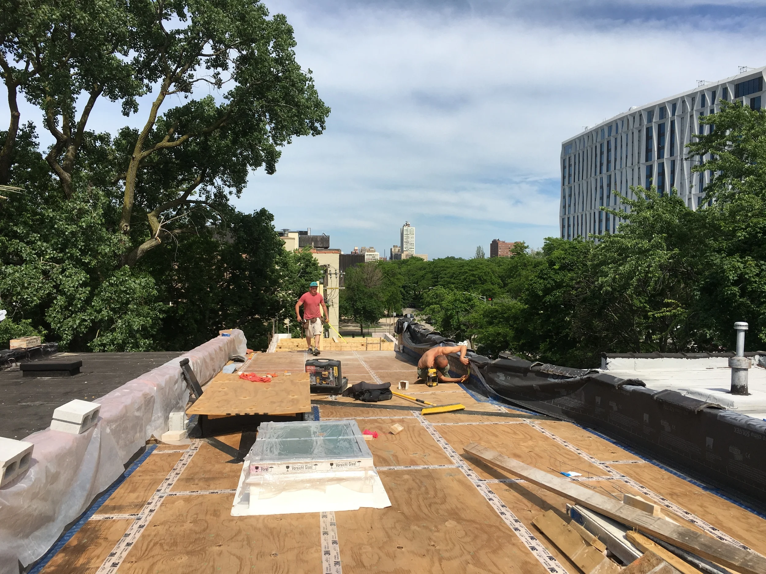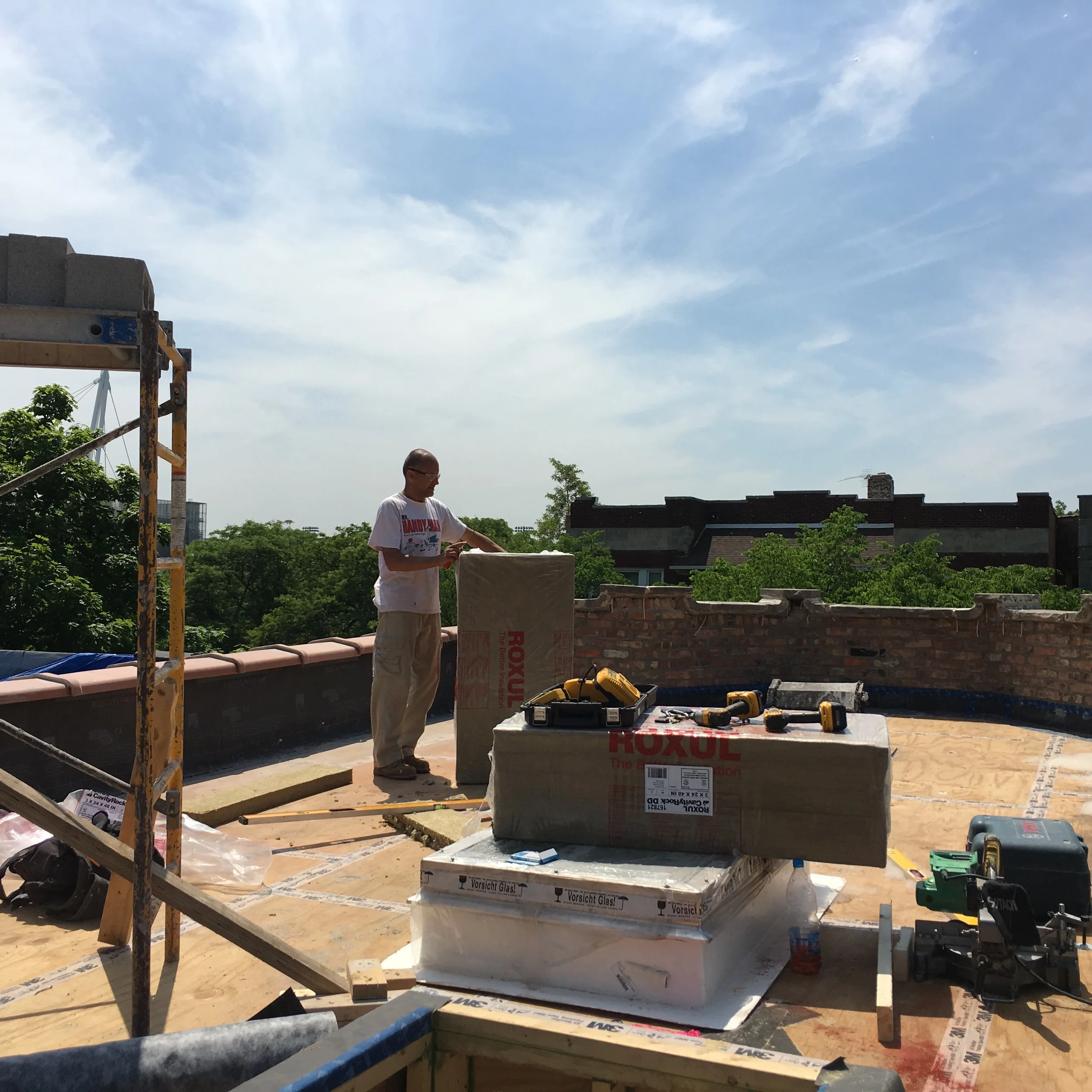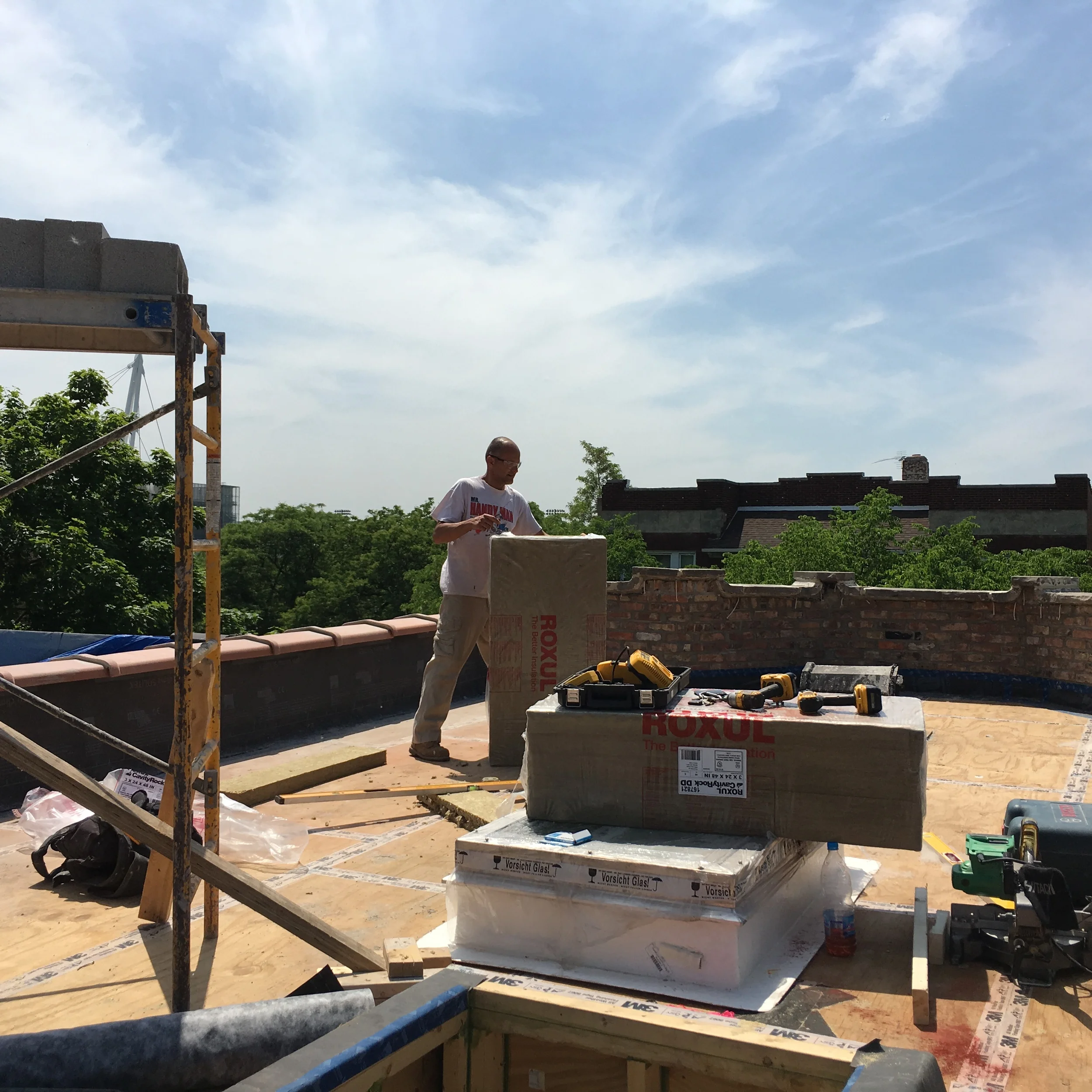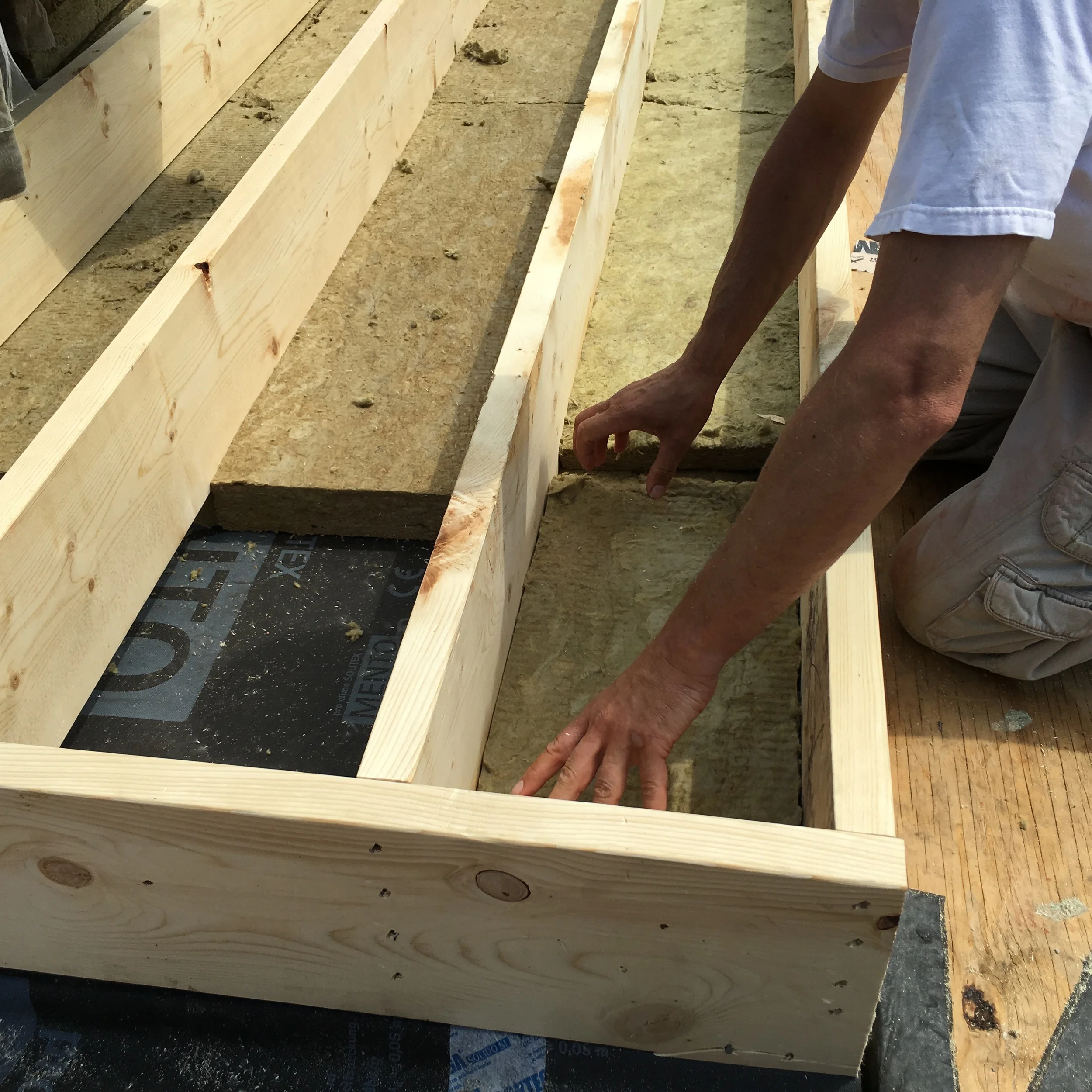 Rebuilt and heightened parapet wall. New LVL roof joists. New skylight box. New roof deck. 6 inches Roxul and 1 inch Poliso insulation above the roof deck and below the roofing material. 12 inches Dense pack cellulose in the roof joist cavities.