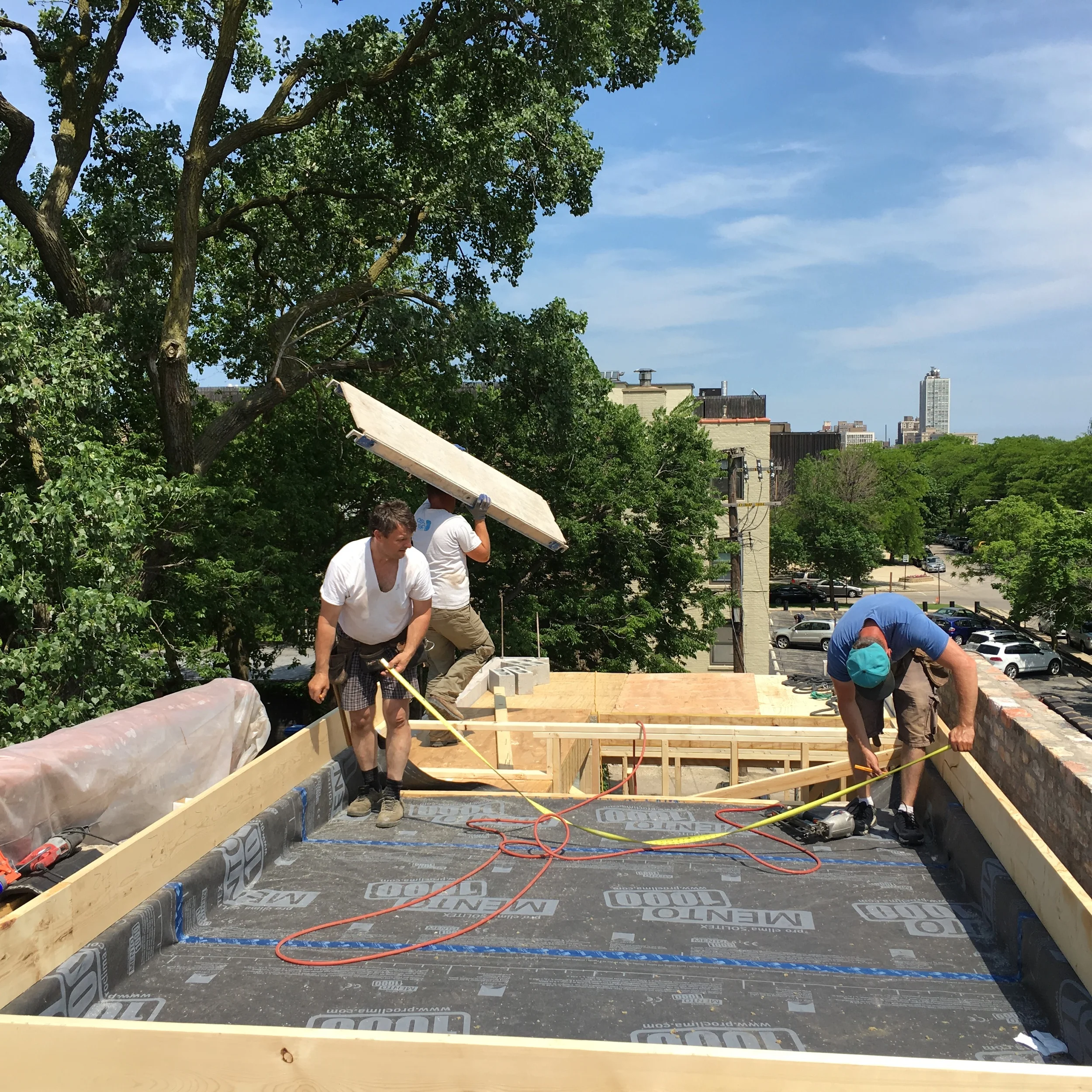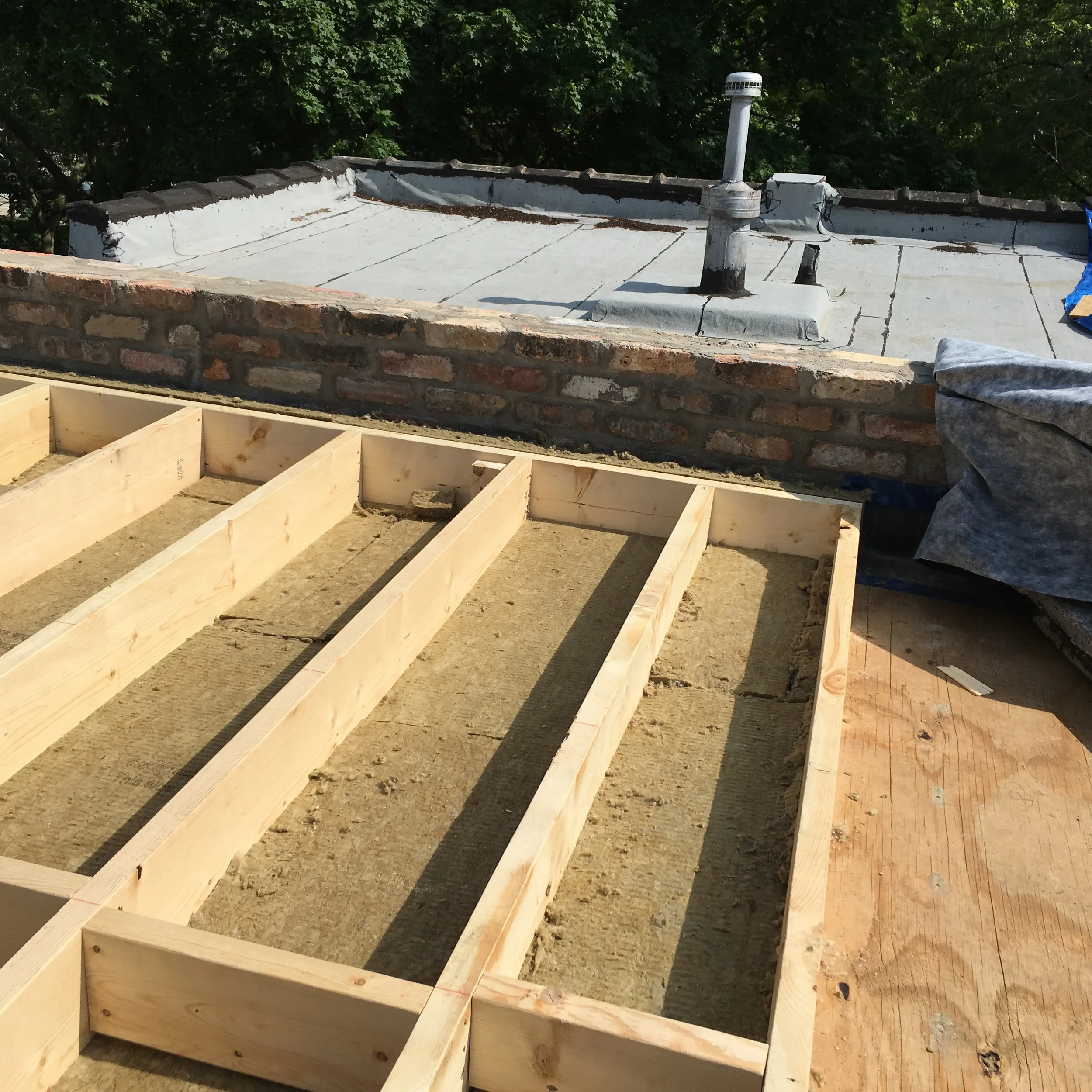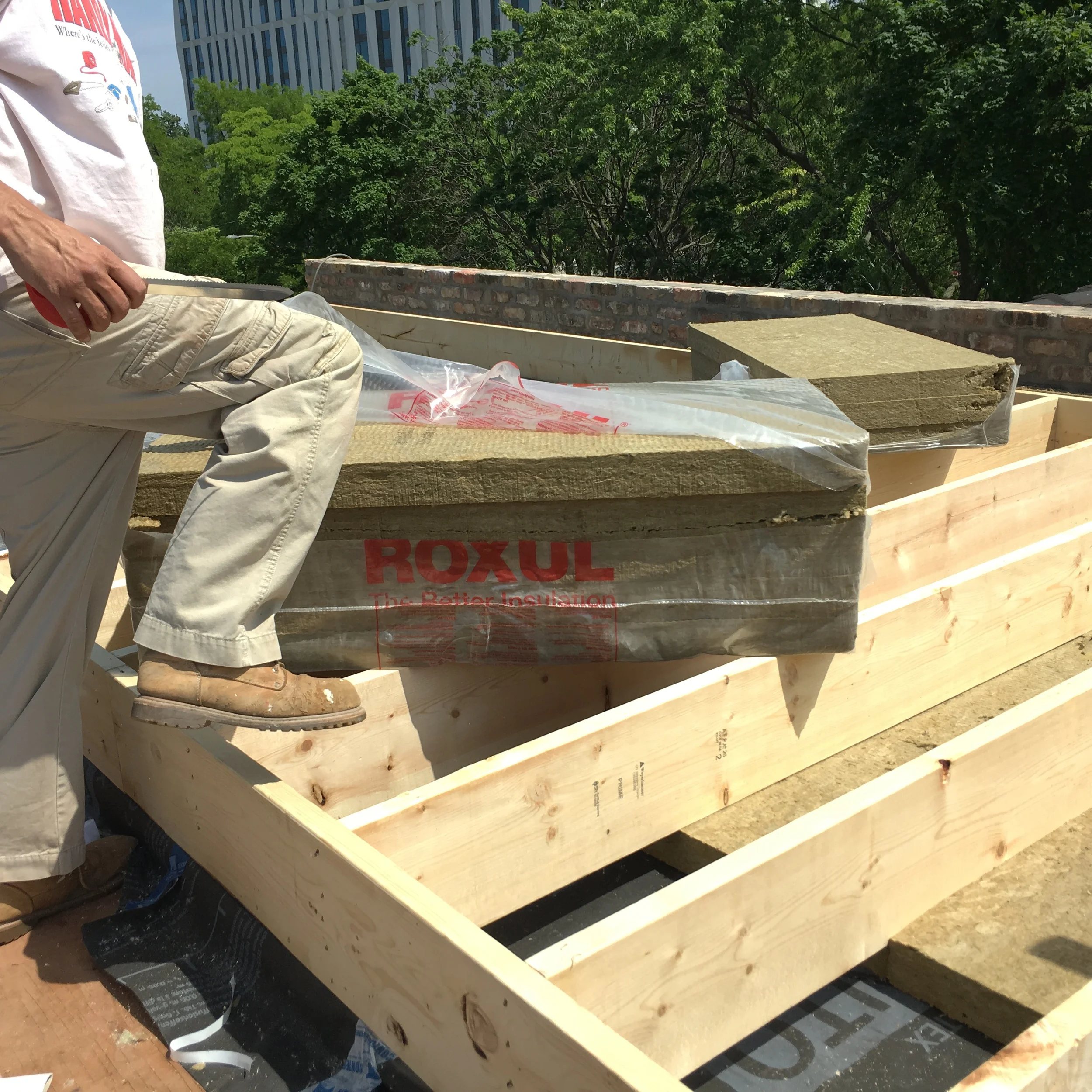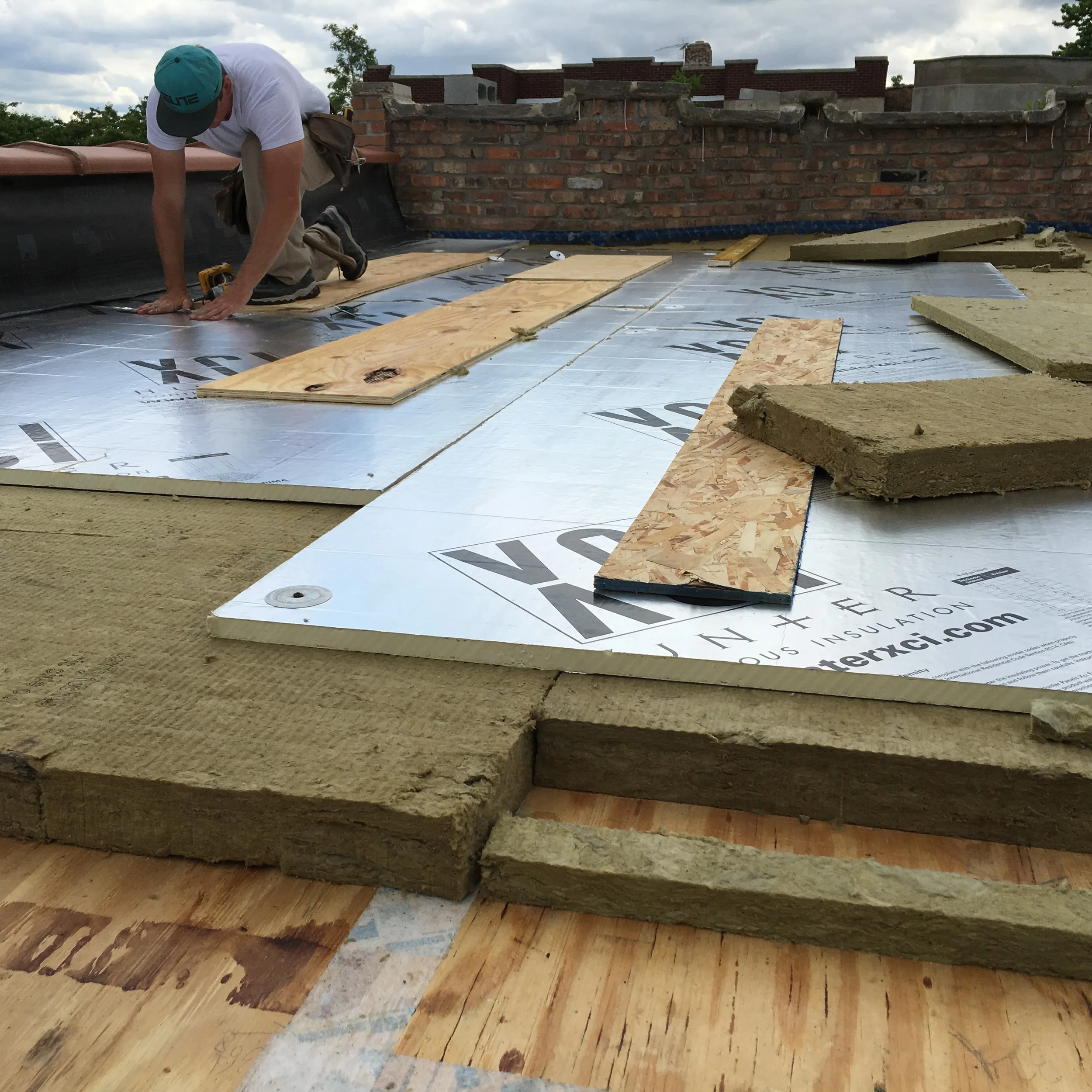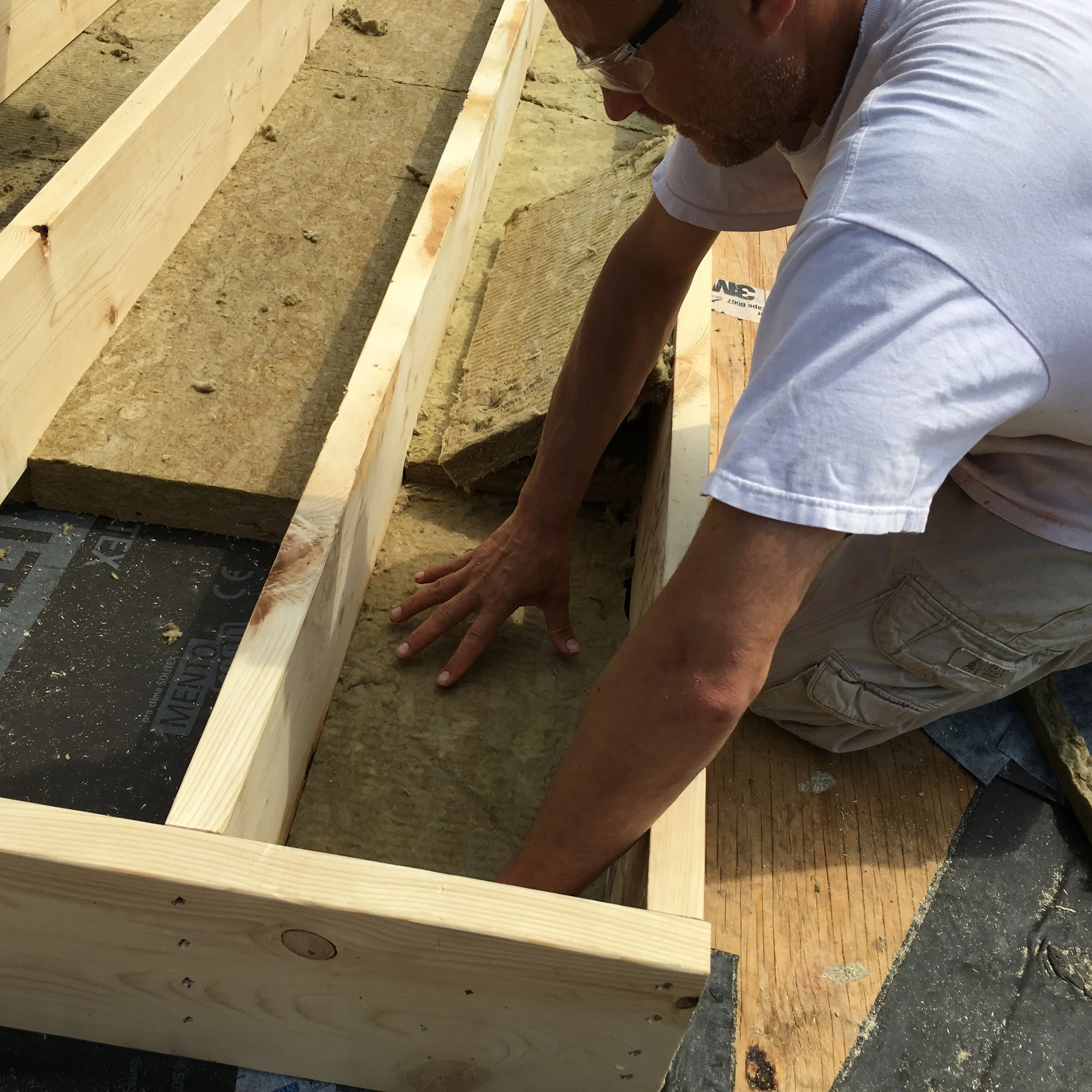 Rebuilt and heightened parapet wall. New LVL roof joists. New skylight box. New roof deck. 6 inches Roxul and 1 inch Poliso insulation above the roof deck and below the roofing material. 12 inches Dense pack cellulose in the roof joist cavities.