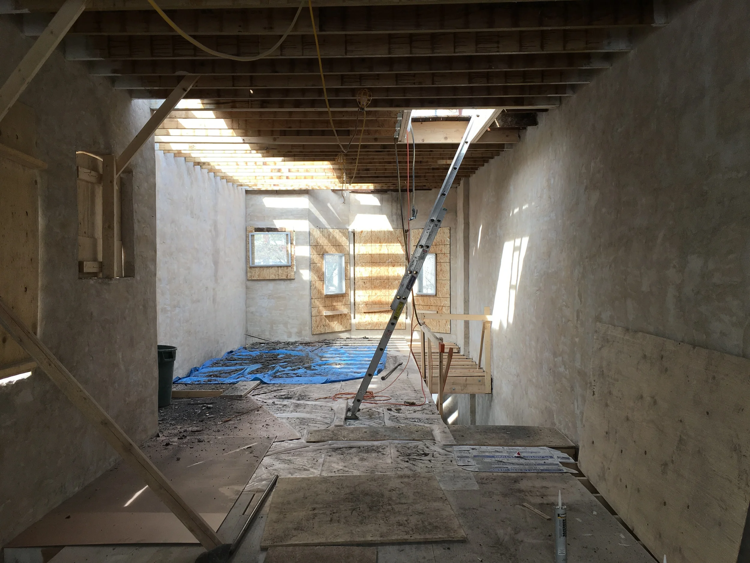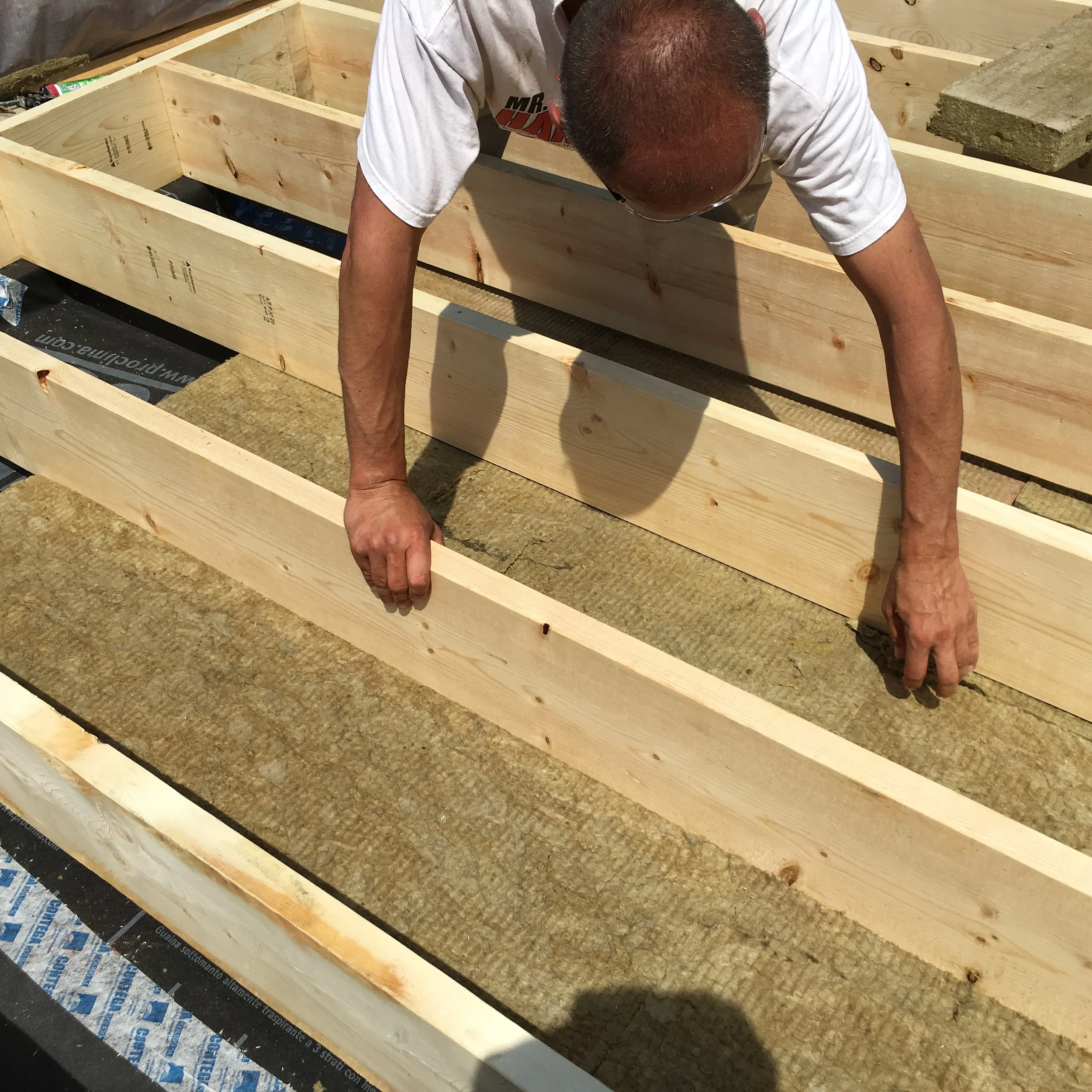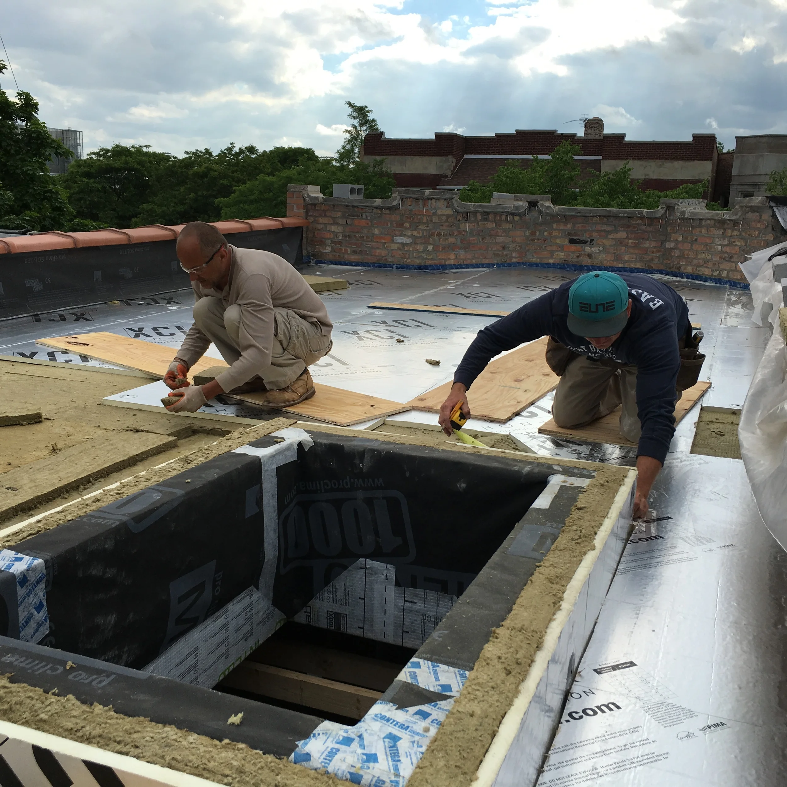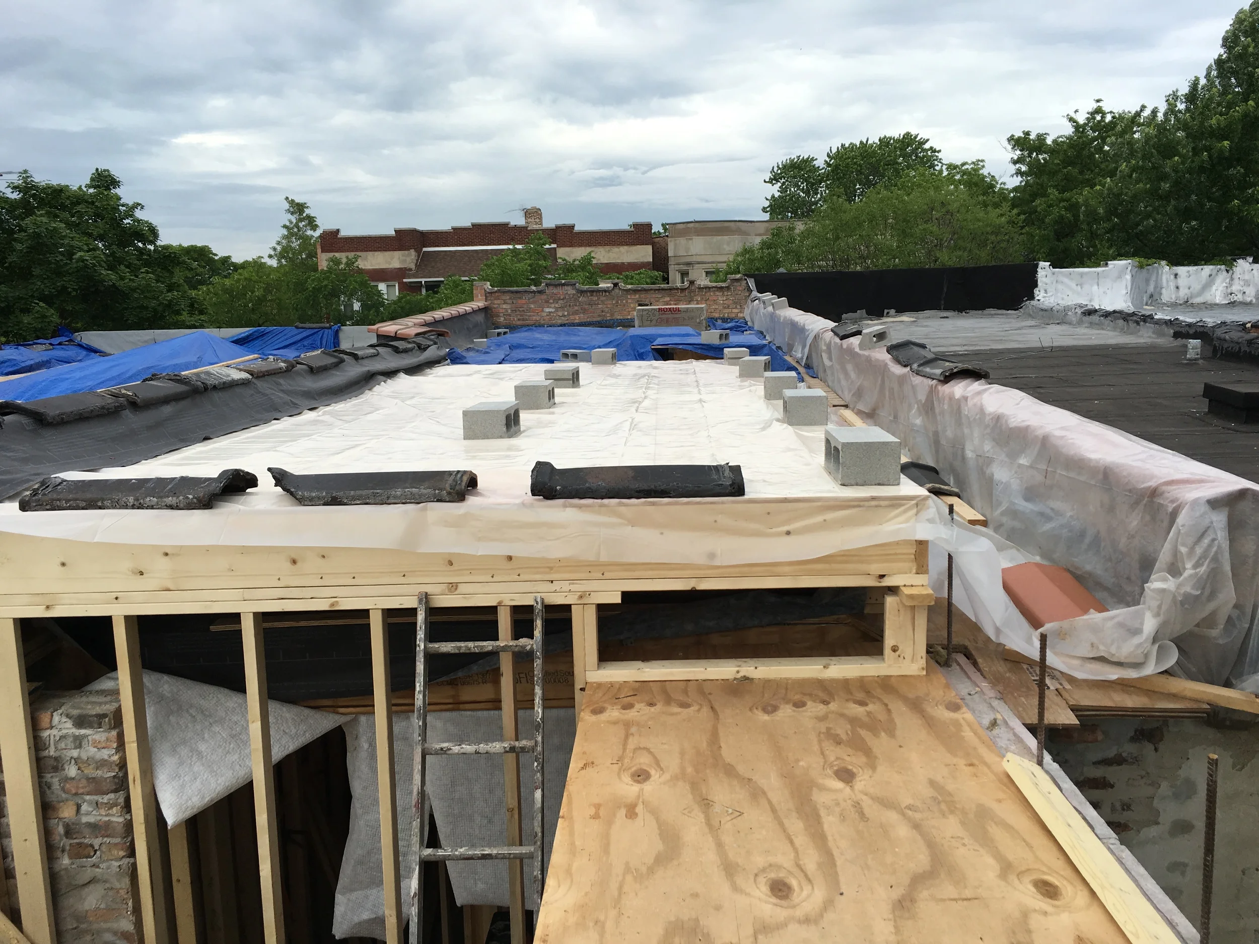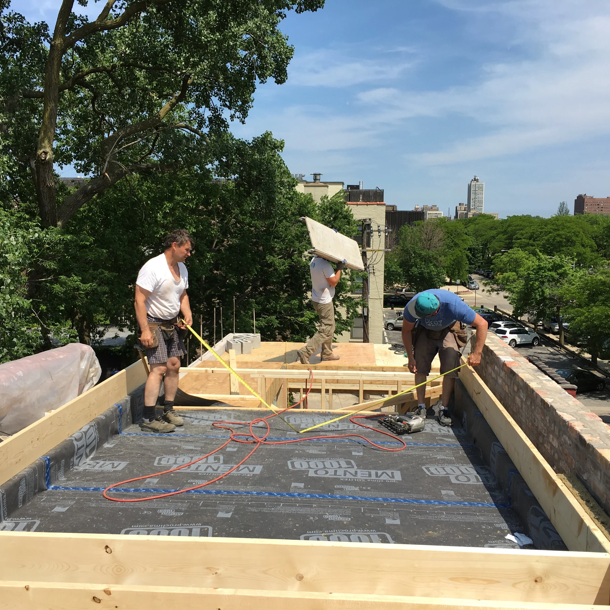 Rebuilt and heightened parapet wall. New LVL roof joists. New skylight box. New roof deck. 6 inches Roxul and 1 inch Poliso insulation above the roof deck and below the roofing material. 12 inches Dense pack cellulose in the roof joist cavities.