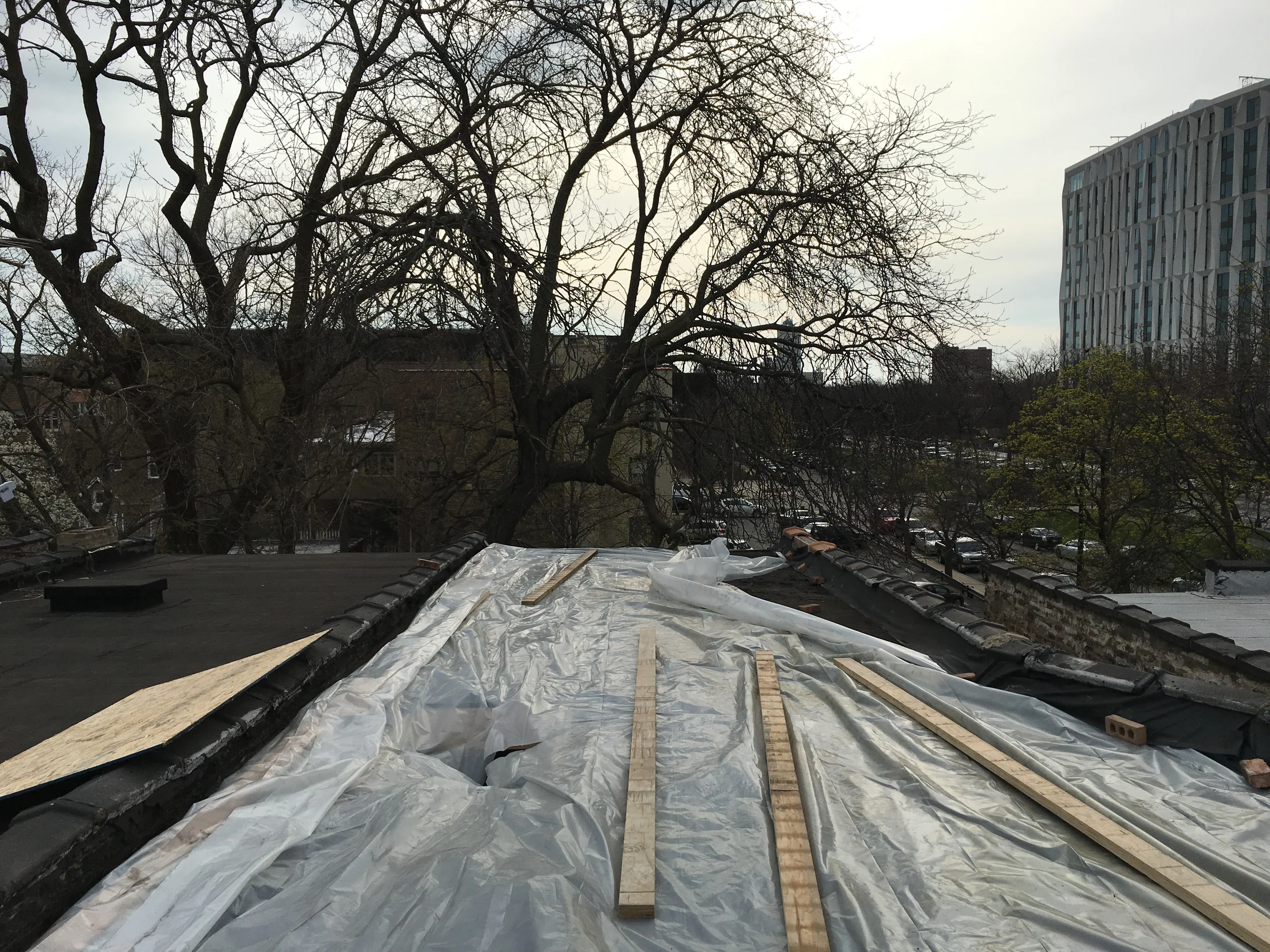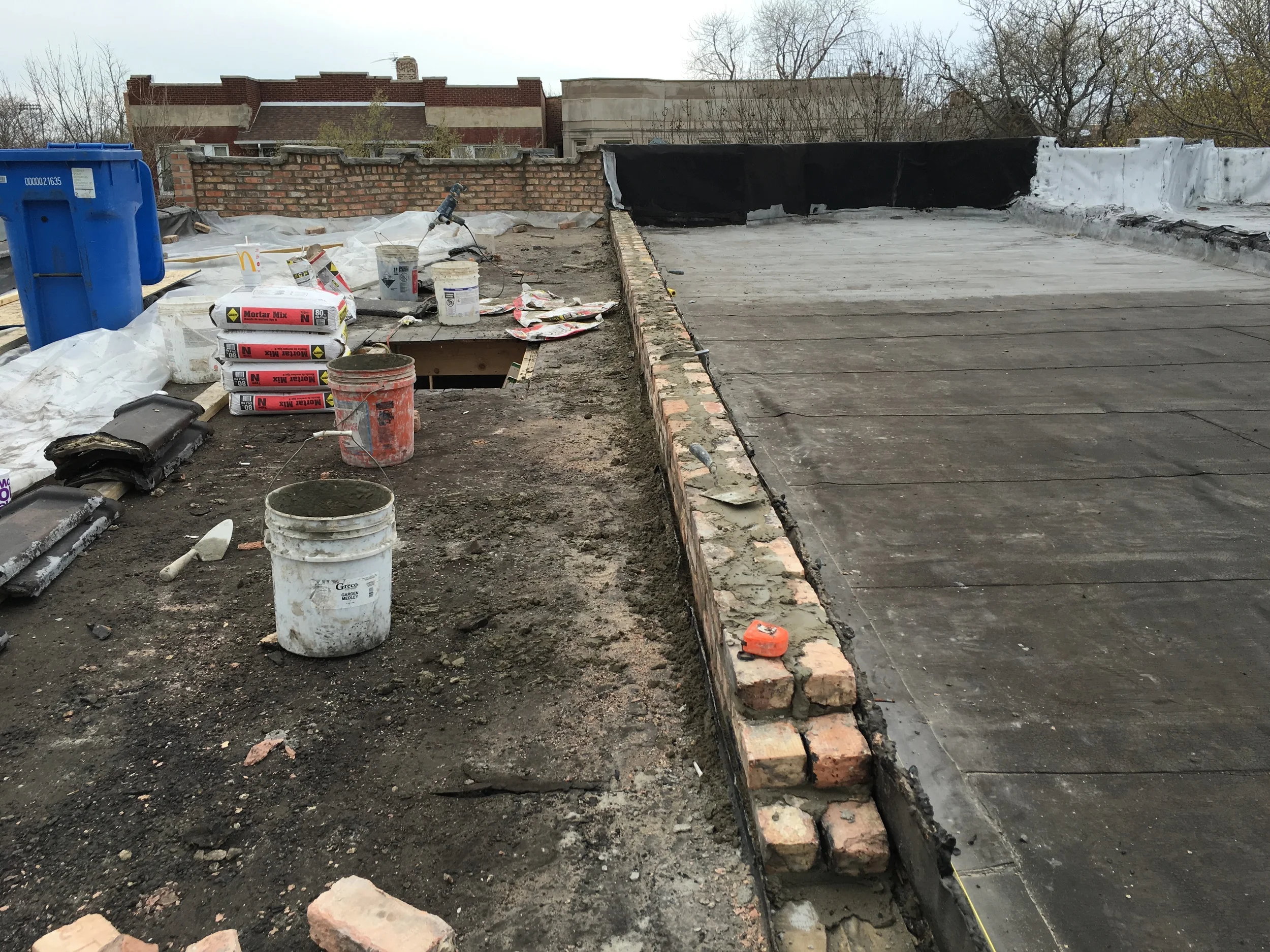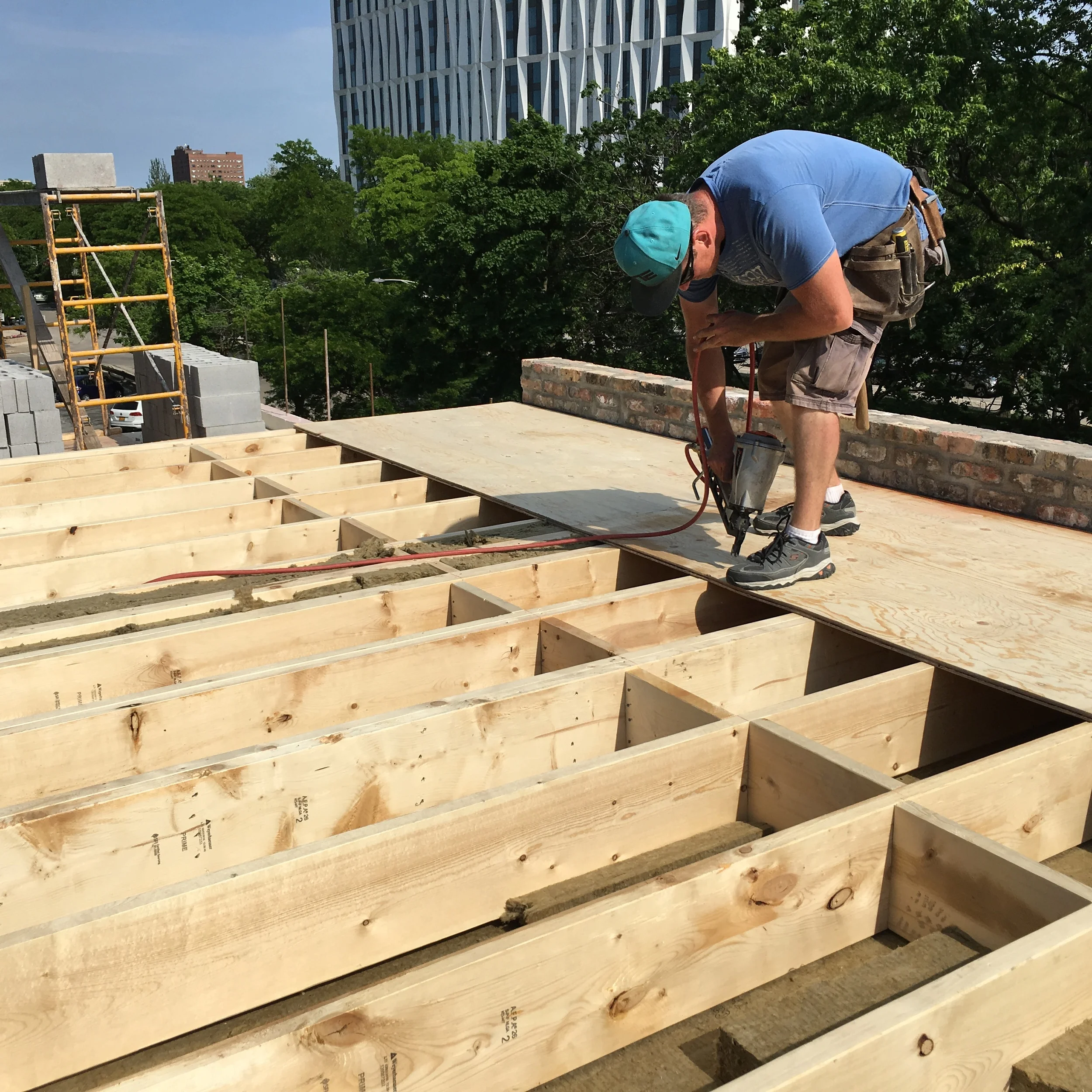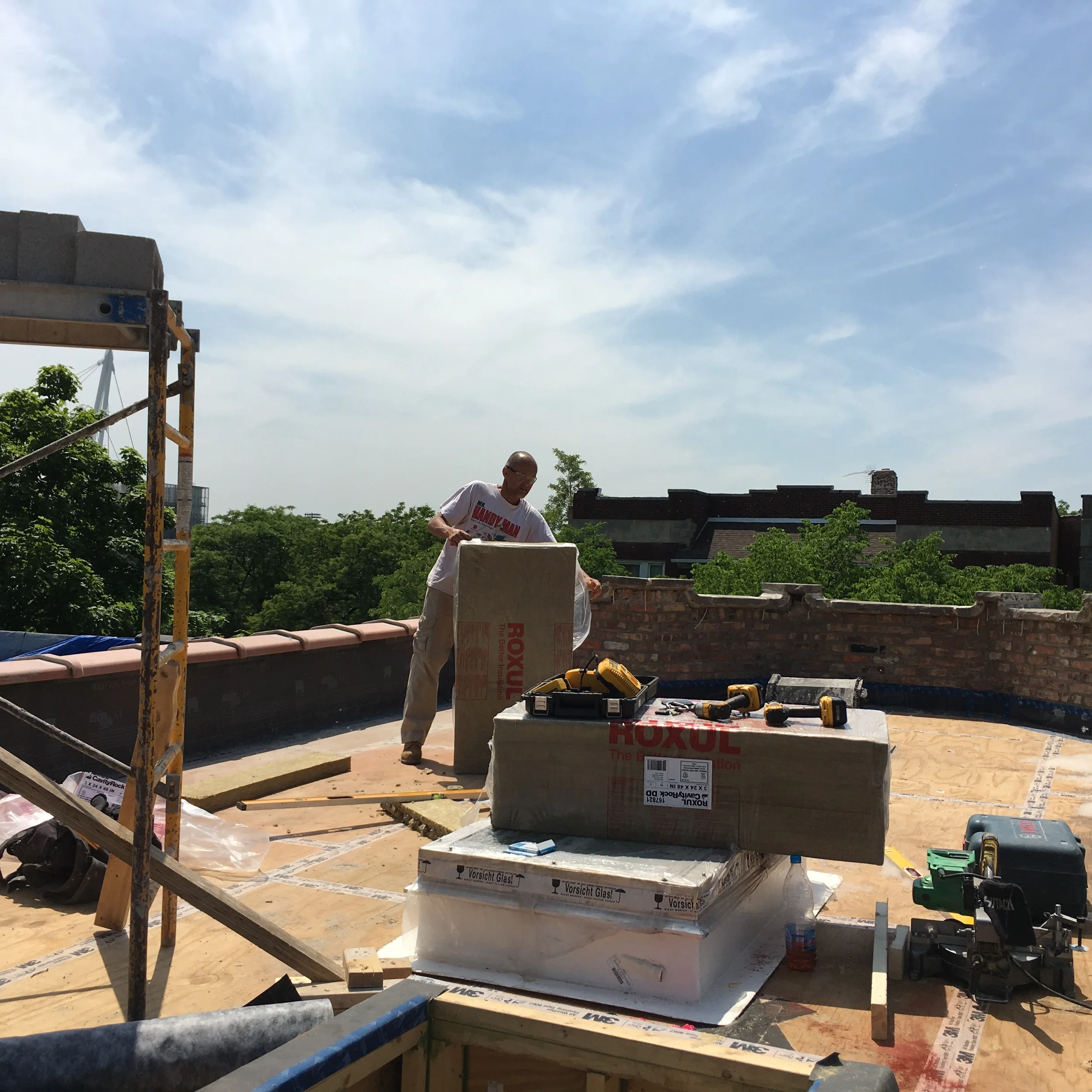 Rebuilt and heightened parapet wall. New LVL roof joists. New skylight box. New roof deck. 6 inches Roxul and 1 inch Poliso insulation above the roof deck and below the roofing material. 12 inches Dense pack cellulose in the roof joist cavities.