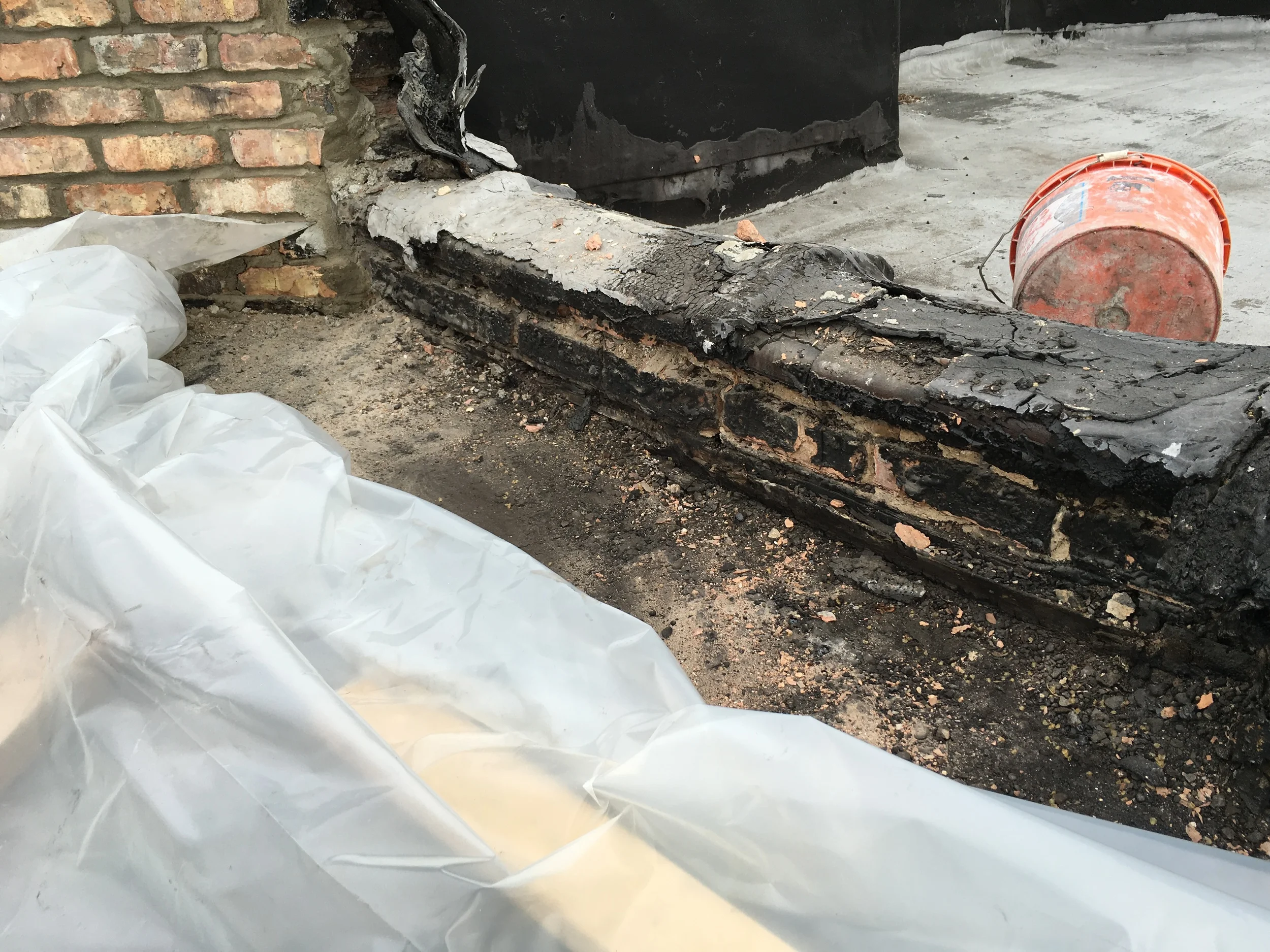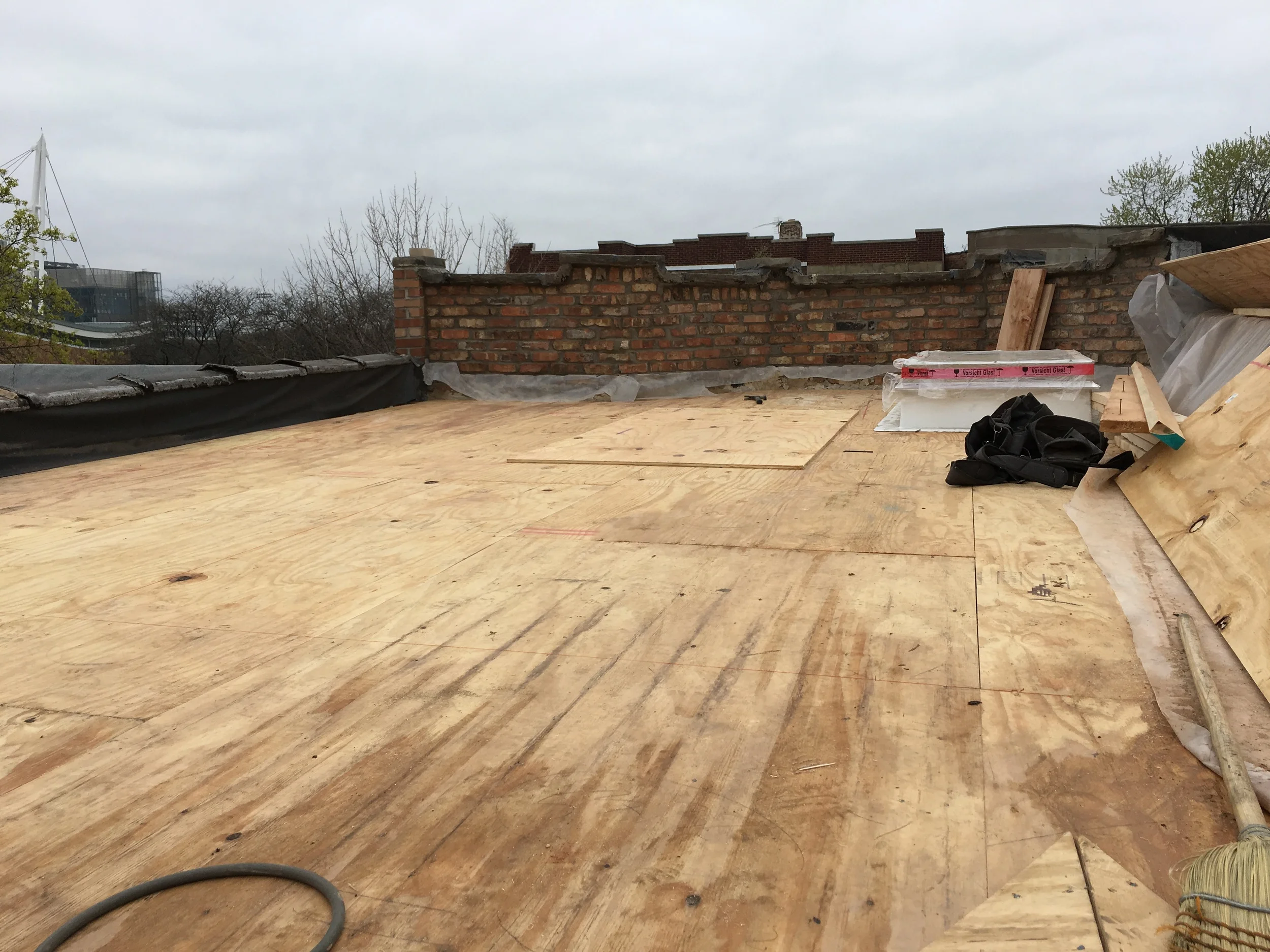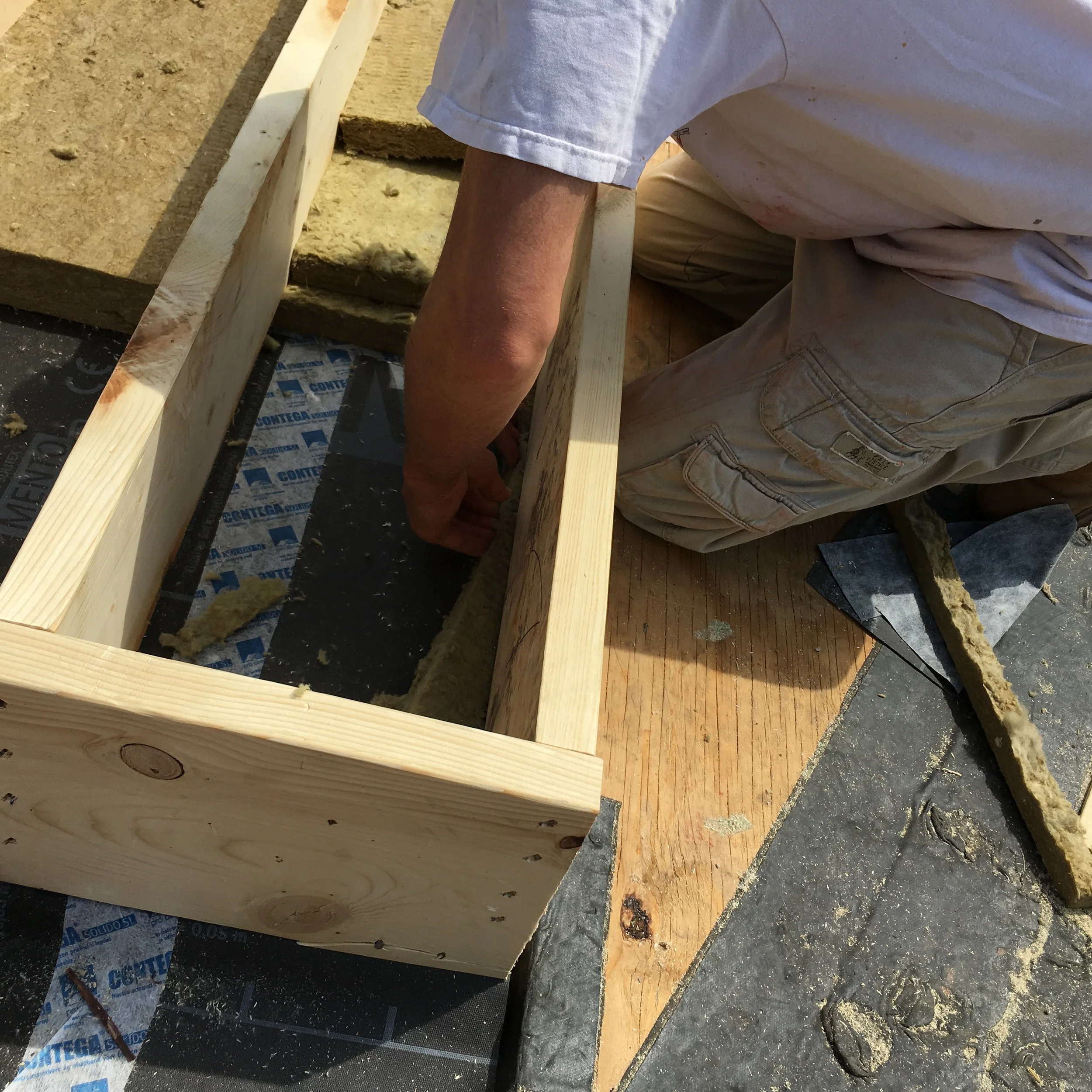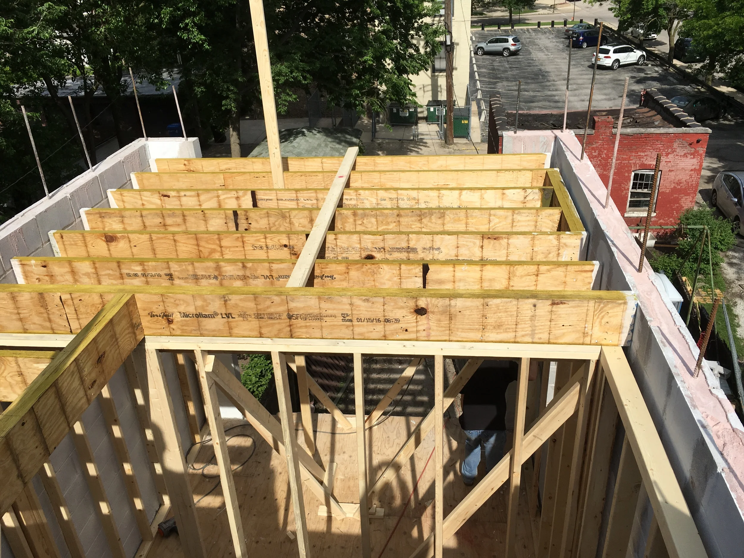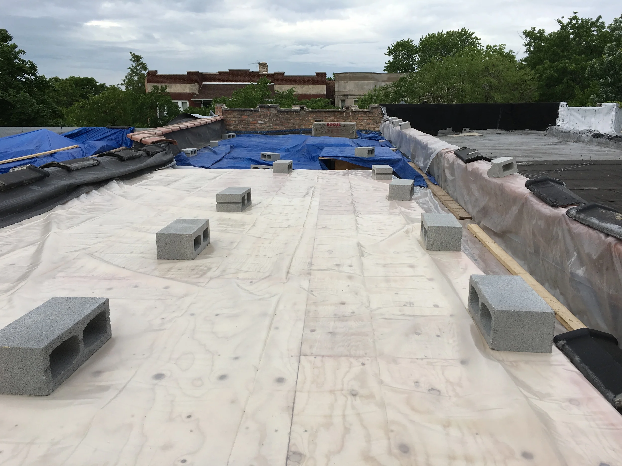 Rebuilt and heightened parapet wall. New LVL roof joists. New skylight box. New roof deck. 6 inches Roxul and 1 inch Poliso insulation above the roof deck and below the roofing material. 12 inches Dense pack cellulose in the roof joist cavities.