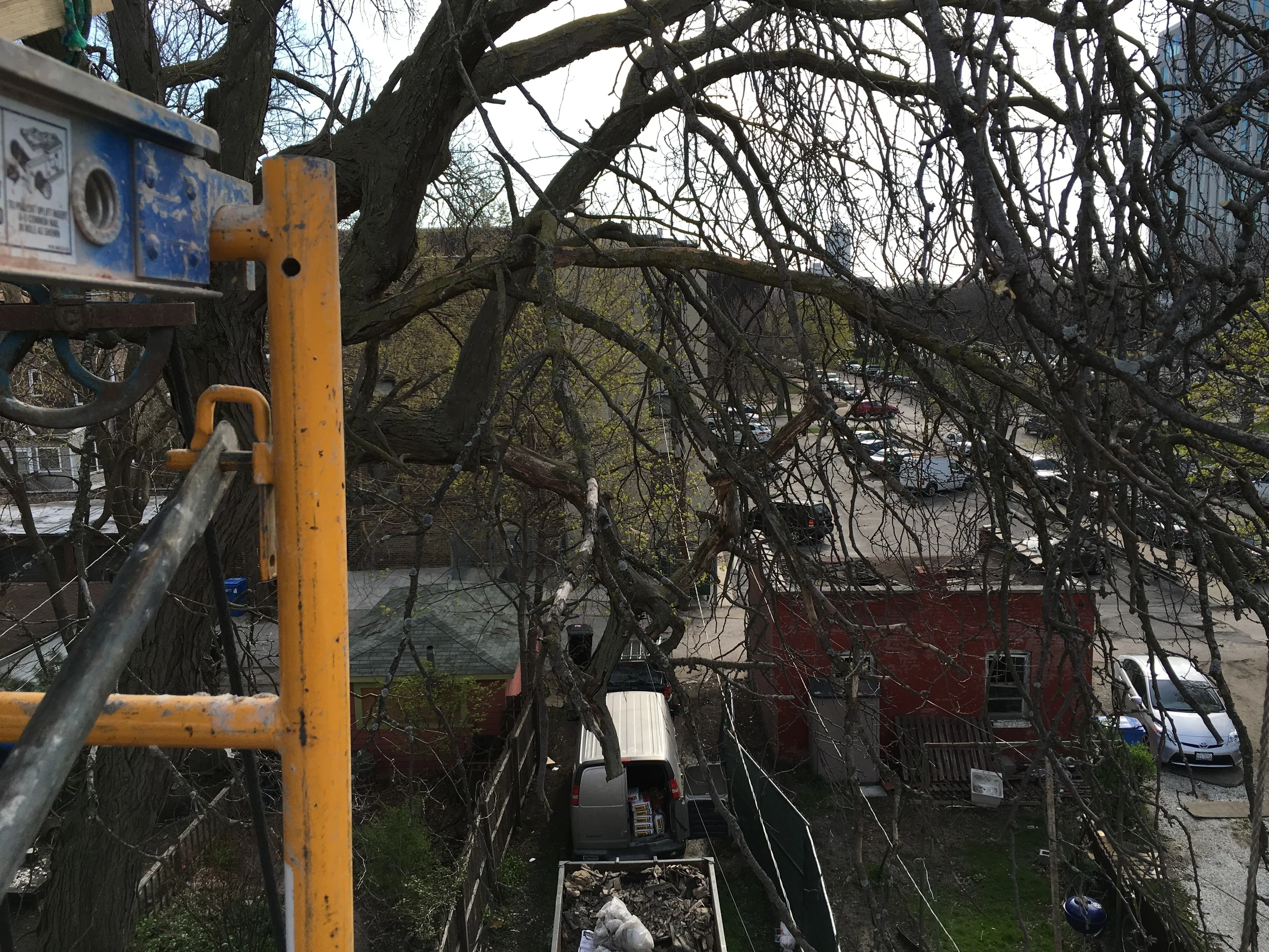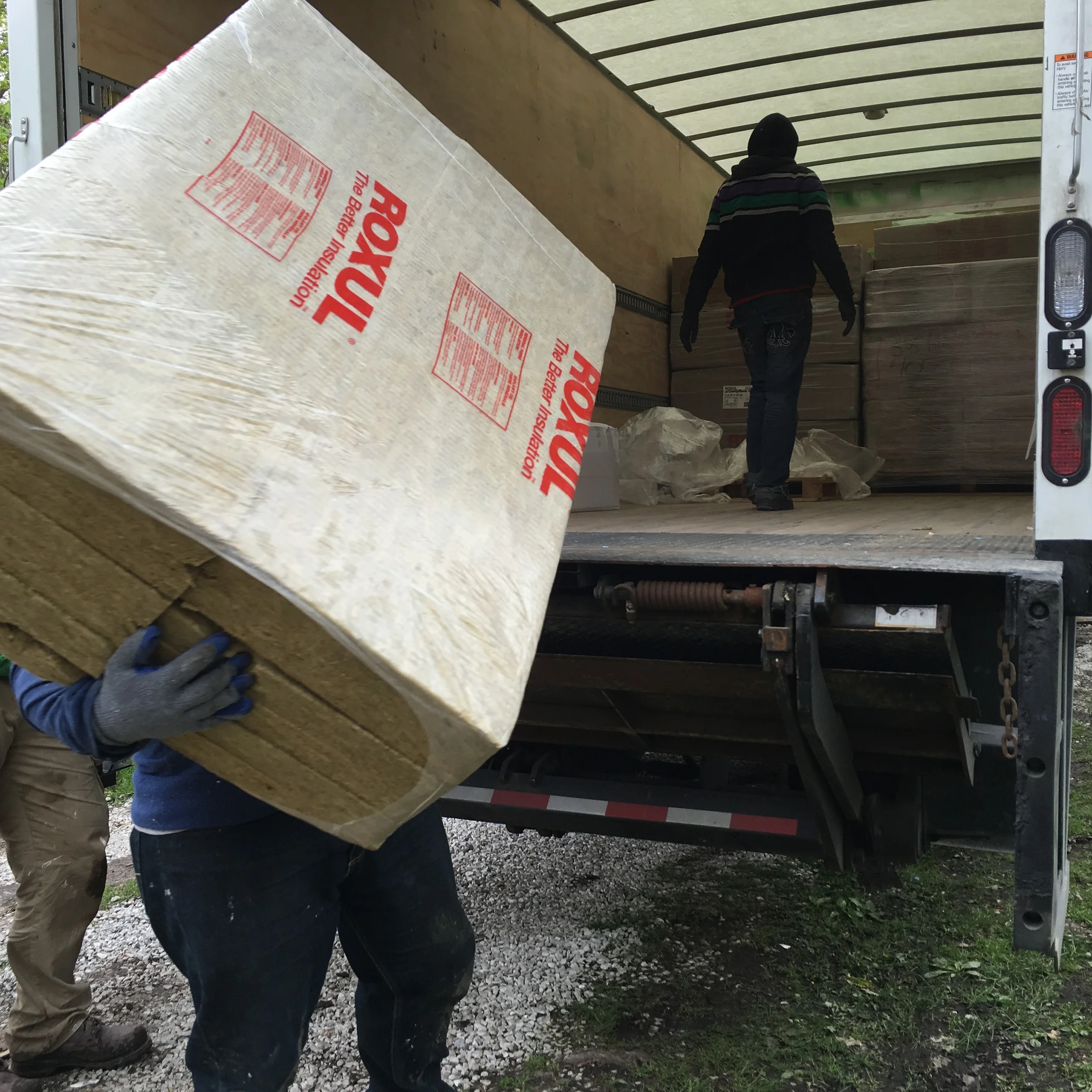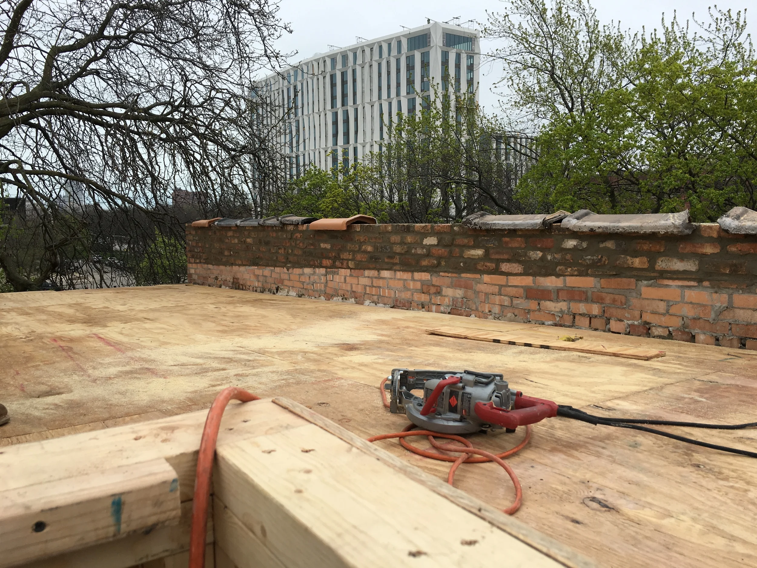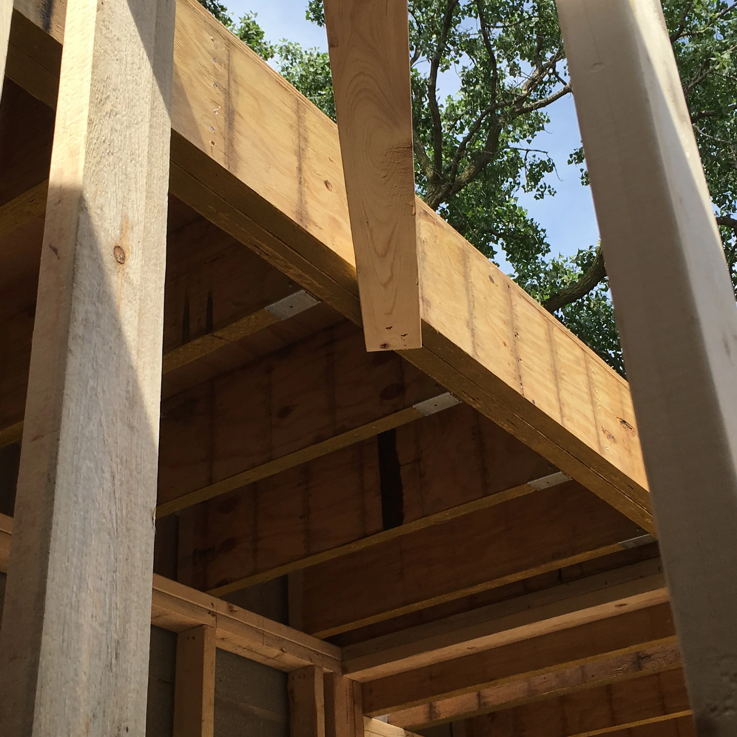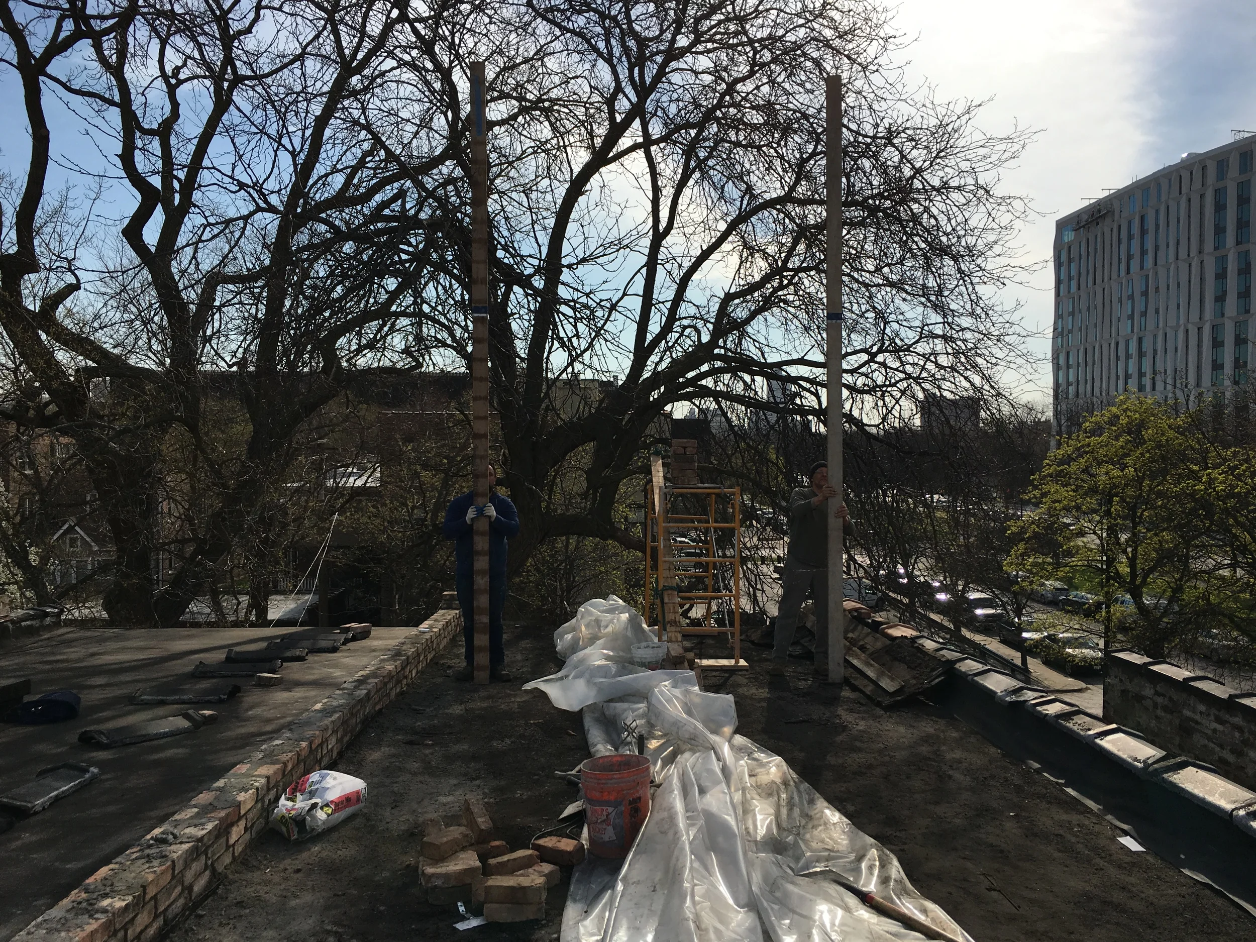 Rebuilt and heightened parapet wall. New LVL roof joists. New skylight box. New roof deck. 6 inches Roxul and 1 inch Poliso insulation above the roof deck and below the roofing material. 12 inches Dense pack cellulose in the roof joist cavities.
